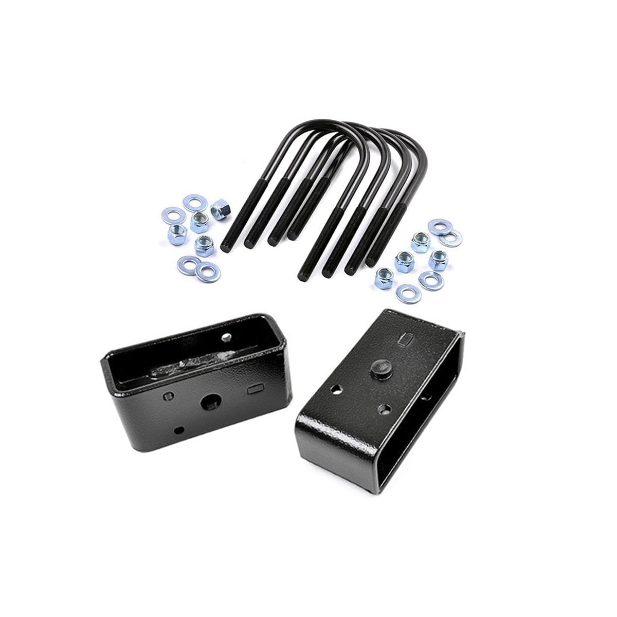 Rough Country's rear block and u-bolt kits provide a simple remedy to an age-old problem that simply happens over the span of your vehicle lift. Each kit offers two fabricated steel blocks that are tapered to reduce driveline angles, and are much stronger than the standard cast block option. These heavy-duty replacements feature a single pin measuring in a 9/16-inch to snuggle fit into your factory axle pad. Also included is a set of e-coated corrosion-resistant steel u-bolts. Our u-bolts offer four inches of thread ensuring that you have plenty of length to securely install this kit to the rear of your vehicle in no time flat.