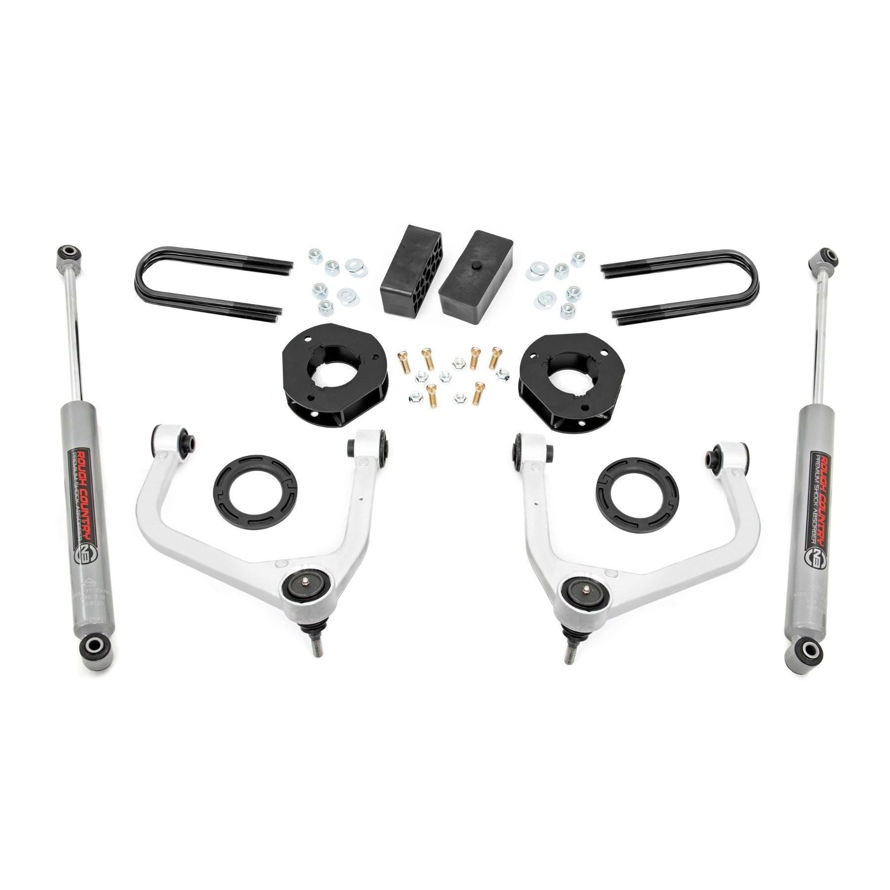 Explore New Heights: GM's fifth-generation Sierra 1500 features an impressive all-new design that's built from the ground up, with aggressive angles and head-turning stylings that fit in beautifully when transformed with Rough Country's 3.5-inch Suspension Lift.Innovative Design and Construction: When changing a vehicle's suspension, the key to preserving ride quality is keeping the geometry of all suspension components as close to their factory angles as possible. Rough Country's 3.5in lift features a set of forged aluminum upper control arms to provide the correct suspension geometry in our most durable control arm to date! This perfect-height lift is a great choice for anyone who wants more than a simple level but doesn't quite want the full height of a 6-inch option. This kit lifts and levels the front of the vehicle with the rear, offering enough increased ground clearance to run up to 33" tires with an improved, aggressive look. We didn't want to limit you to one standard kit. Rough Country's 3.5-inch kit is configurable with all the shock options that we offer. This allows you to choose which shock series you want! Ranging from our nitrogen-charged N3 shocks to our Vertex reservoir shocks the power to choose is in your hands.Installation: Requiring the use of a strut compressor to install, an estimated timeframe of 5-6 hours is recommended to complete this full installation. This full kit can be installed at home and can be completed efficiently and quickly!Limited Lifetime Replacement Warranty: Rough Country's 3.5" Suspension Lift Kit is backed with a limited lifetime replacement warranty towards manufacturer defects. As such, the product is protected from structural and workmanship damage after the date of purchase. With our industry-leading warranty give yourself peace of mind when using Rough Country's Suspension products! Balanced Ride Height: Achieves a perfectly leveled stance by lifting the front of your vehicle 3.5 inches and the rear 2.5 inches.