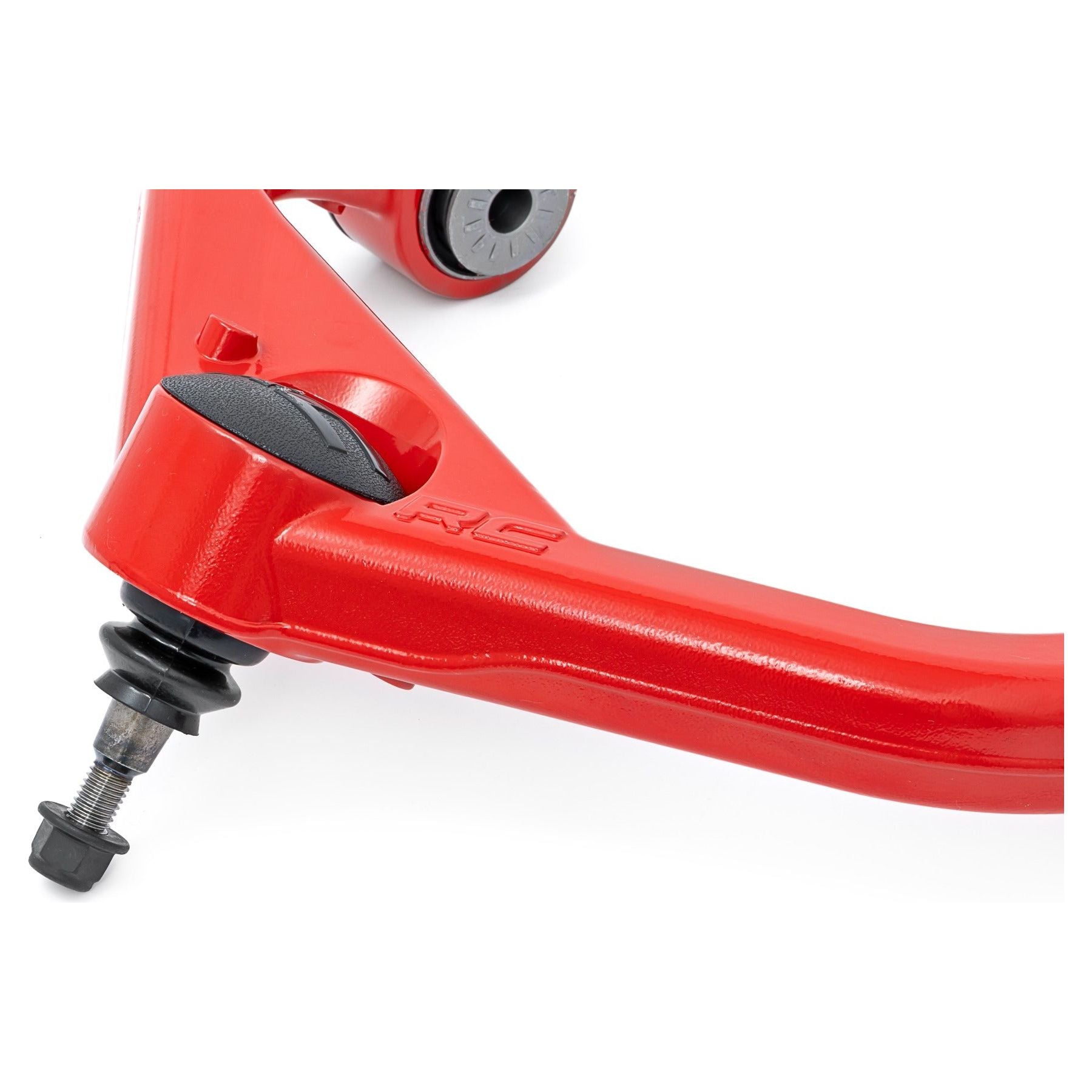 High Strength Ball Joints. Rough Country’s Forged Upper Control Arms use POM ball joints which reduces metal-to-metal contact for less maintenance and longer service life versus standard or OE replacements. These Ball joints feature a POM ball race for an extremely low co-efficient of friction and an oversize ball diameter reduces load and improves range of motion in a fully greaseable design. Rough Country’s Forged Upper Control Arms also feature durable rubber bushings rubber bushings for superior quality and durability.