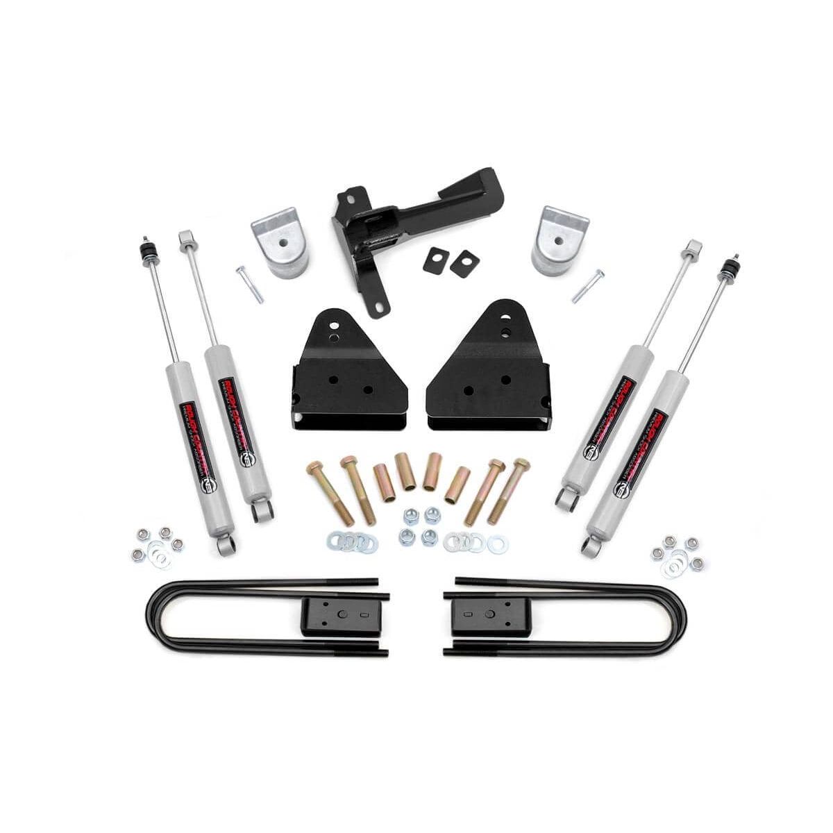 A set of Rough Country's premium N3 shocks are also included. These fine tuned 10-stage variable high-pressure Nitrogen charged shocks offer a fantastic blend of off-road action and smooth highway ride quality. With a durable 18mm spring-loaded piston rod and faster-cooling 54mm shock body.