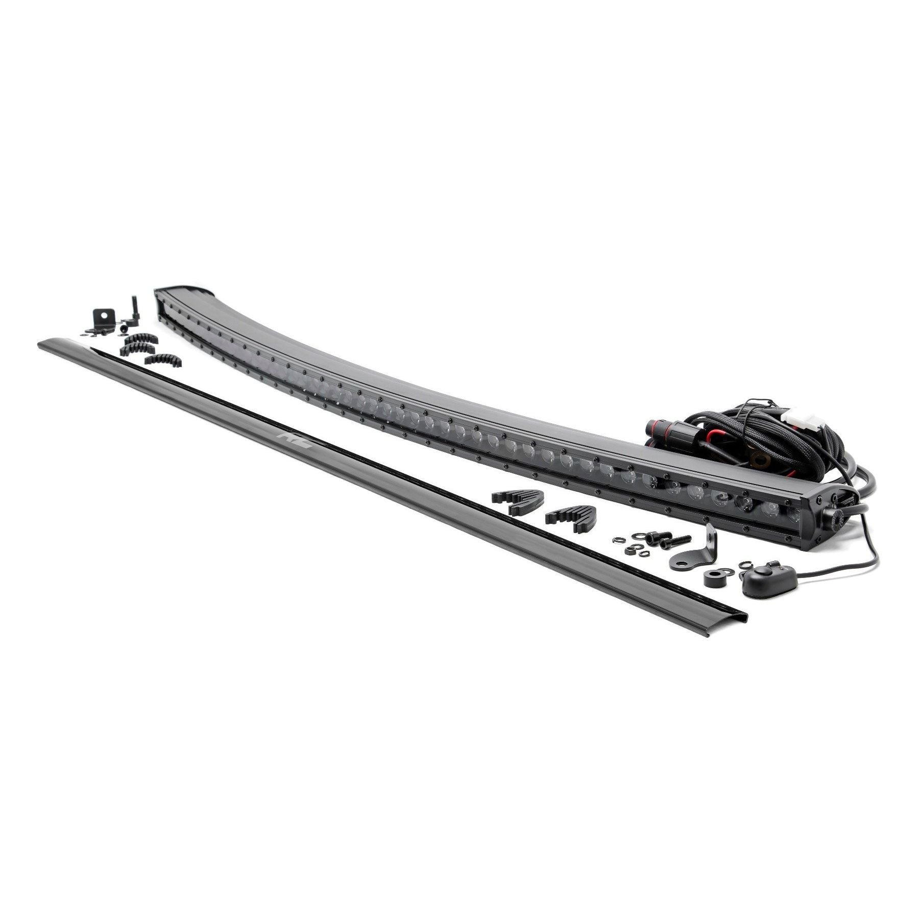 Command the Dark: Light up the night and stay on the trails longer with Rough Country's sleek 50-inch Curved Single Row CREE LED Light Bar. This powerful light bar offers 19,200 lumens of illumination and 2400 watts of energy-efficient output, all housed in a stylish, modern frame. Featuring 48 high-intensity 5-watt CREE LEDs, it delivers superior brightness and durability for any adventure.The sleek black panel design complements vehicles with black accents, such as grilles, wheels, bull bars, or steps. Designed for all-weather performance, this light bar comes with a durable die-cast aluminum housing, ensuring maximum strength and heat dissipation. It also backed by an IP67 waterproof rating, providing reliable performance even in harsh conditions.Installation is made simple with the included premium, flat-wound wiring harness, complete with an on/off switch for easy operation. The light bar also features Rough Country's Light Bar Noise Silencers, designed to eliminate unwanted hums, whistles, and wind noise typically found in mounted LED light bars.This light bar includes both end mounts and adjustable post mounts, offering multiple mounting options for maximum versatility. A snap-on cover protects the lens, while Moisture Breather technology reduces moisture build-up inside the light. Plus, it all backed by a 3-year warranty for peace of mind. 19200 lumens for bright, powerful illumination.