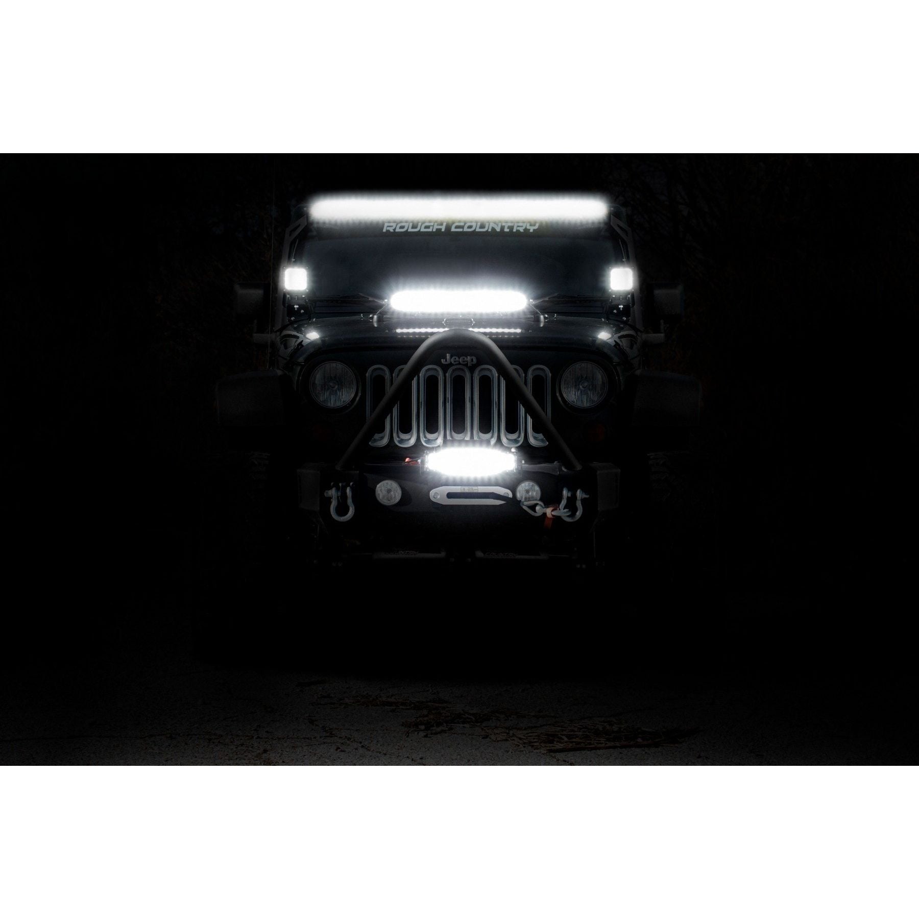 Command the Dark: Light up the night and stay on the trails longer with Rough Country's sleek 50-inch Dual Row CREE LED Light Bar. This powerful light bar offers 43,200 lumens of illumination and 200 watts of energy-efficient output, all housed in a stylish, modern frame. Featuring 96 high-intensity 5-watt CREE LEDs, it delivers superior brightness and durability for any adventure.The sleek black panel design complements vehicles with black accents, such as grilles, wheels, bull bars, or steps. Designed for all-weather performance, this light bar comes with a durable die-cast aluminum housing, ensuring maximum strength and heat dissipation. It also backed by an IP67 waterproof rating, providing reliable performance even in harsh conditions.This light bar contains 48 amber daytime running LEDs for enhanced visibility and safety. Installation is made simple with the included premium, flat-wound wiring harness, complete with an on/off switch for easy operation. The light bar also features Rough Country's Light Bar Noise Silencers, designed to eliminate unwanted hums, whistles, and wind noise typically found in mounted LED light bars.This light bar includes both end mounts and adjustable base mounts, offering multiple mounting options for maximum versatility. A snap-on cover protects the lens, while Moisture Breather technology reduces moisture build-up inside the light. Plus, it all backed by a 3-year warranty for peace of mind. 43200 lumens for bright, powerful illumination.