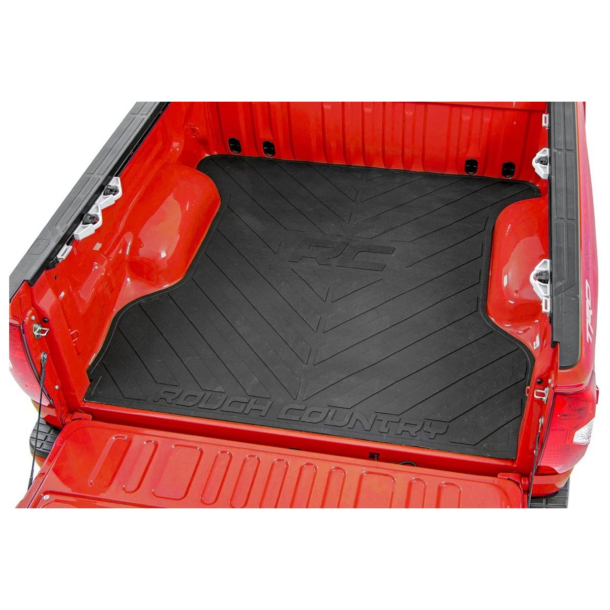 Innovative Design and Material. Keep your truck bed free from scuffs, scrapes, and scratches with Rough Country Truck Bed Mats. These heavy-duty, 3/8-inch thick, contoured rubber mats are nearly indestructible; made from a high-quality rubber compound that won’t crack in extreme temperatures or fade when exposed to the sun. This stylized bed mat features a large "RC" and "Rough Country" logo with angled lines for an improved look that also protects your truck bed.