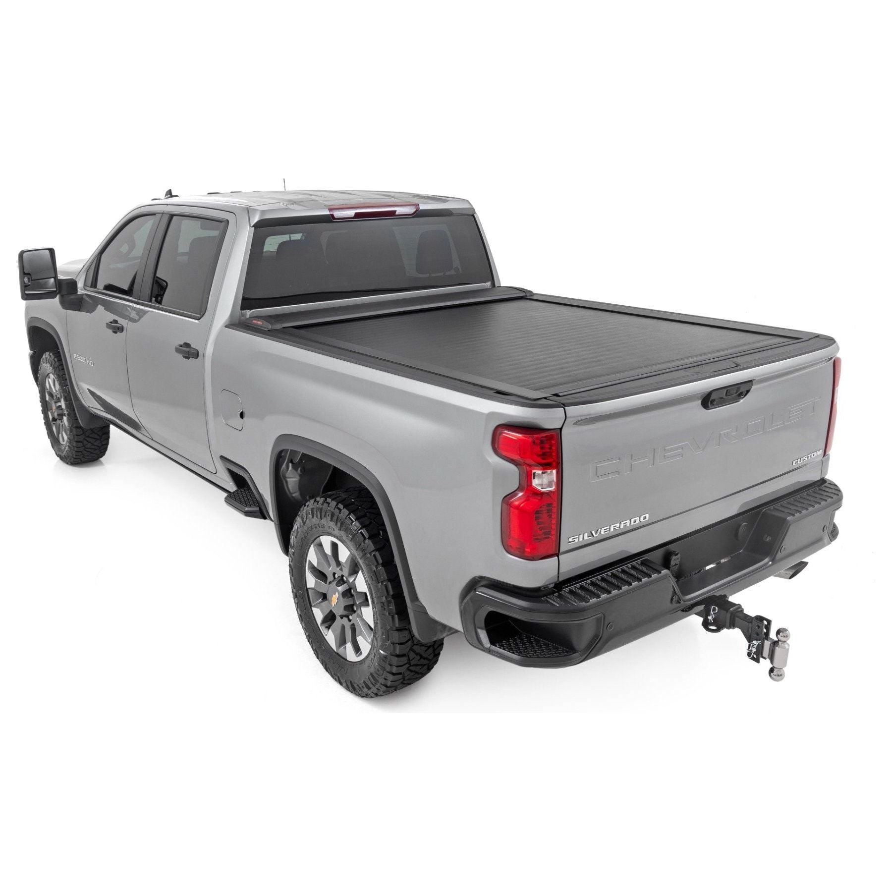 Superior Protection and Functionality. Protect your bed from weather and add security with Rough Country’s sleek Retractable Bed Covers. Boasting a weather-resistant vinyl covering over a rigid aluminum panel design Rough Country's Retractable Covers sit firmly on the bed rails allowing for full rear visibility. These durable bed covers feature a flush, low-profile design that gives your truck a clean, sleek look while protecting the contents of your bed.