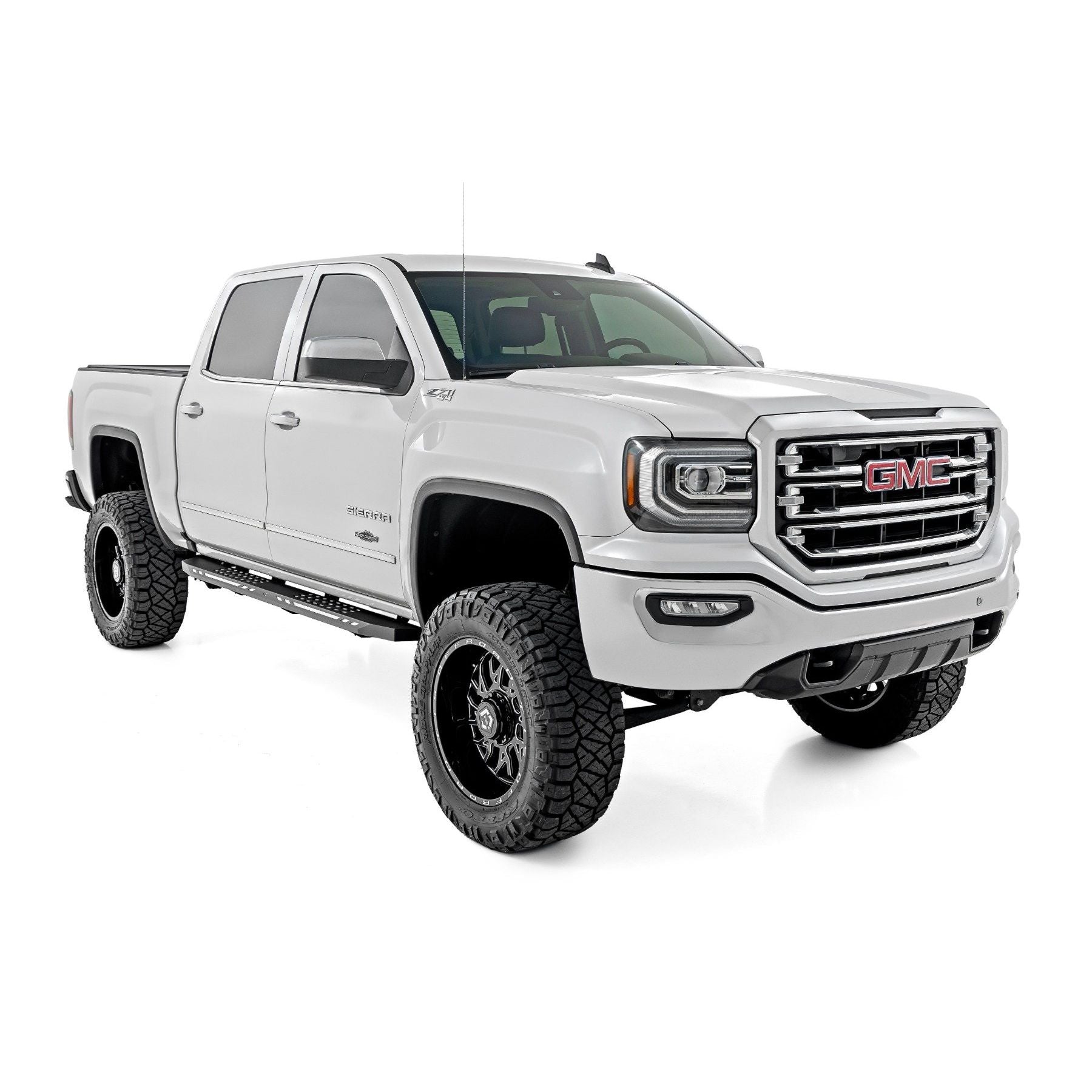 Aggressive Style Meets Everyday Functionality: Upgrade your truck's look and performance with Rough Country's AC2 Running Boards. These premium cab-length steps combine rugged durability, modern styling, and practical convenience in one sleek package.Built for Strength and Style: Crafted from heavy-duty, one-piece aluminum, the AC2 Running Boards deliver exceptional strength without the weight. A black powder-coated finish offers superior corrosion resistance, shielding against rust, wear, and harsh weather.Maximum Accessibility: Easily enter and exit your truck thanks to the wide step surface and lowered profile, perfect for lifted vehicles or daily drivers alike. The cab-length design offers full coverage and enhances your truck's side profile with clean, aggressive lines.Integrated Illumination: Stay visible and stand out with built-in LED lighting. Customizable LED Output lets you choose between amber or white via an internal switch, while Automatic Activation engages the lights when your door opens, thanks to a built-in magnetic sensor.Enhanced Protection and Clean Looks: The AC2 boards also provide a barrier against road debris, rock chips, and mud while covering up exposed frame components for a seamless, finished appearance.Body Lift Compatible: No need to worry about aftermarket modifications, these boards are fully compatible with or without a body lift, ensuring a perfect fit across various setups.Hassle-Free Installation: Install with ease using Rough Country's simple, bolt-on design. No cutting, welding, or drilling required.Warranty You Can Trust: Backed by Rough Country's Limited Lifetime Warranty on structural components and a 1-year warranty on the finish for total peace of mind. Simple Bolt-On Installation: Installs easily with basic hand tools, no drilling or cutting required.
