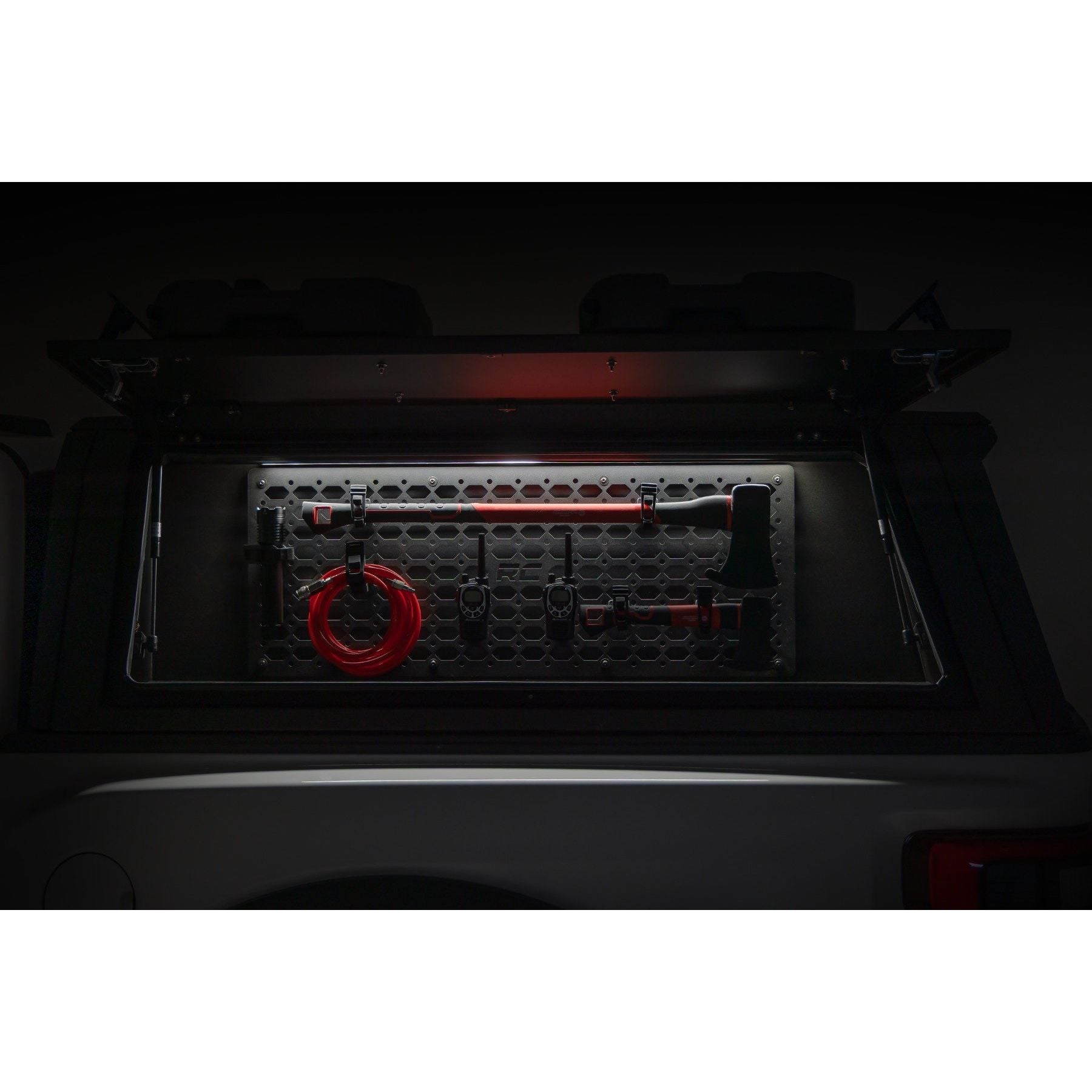 Maximize your truck's storage potential with the Rough Country Bed Cap Molle Panel Storage Bin. Designed as the perfect addition to the Rough Country Bed Cap, this rugged Molle panel bin enhances organization and accessibility while maintaining a tough, trail-ready design. With a durable powder-coated finish, and integrated LED lighting, this storage solution is built for convenience and reliability.Seamless Integration: Designed as the perfect add-on for the Rough Country Bed Cap, this Molle panel bin enhances your truck's storage versatility.Rugged and Durable: Built with a tough powder-coated finish, it resists wear and corrosion to handle the toughest conditions.Optimized Organization: Provides unlimited accessory attachment options behind a secure gullwing door, giving you extra space for tools and gear.Quick & Easy Installation: Engineered for hassle-free mounting, so you can spend less time installing and more time on the road.Built-In LED Illumination: Features an integrated roof-mounted LED strip for enhanced visibility in low-light conditions.Perfect for maximizing storage efficiency, this driver's side Molle panel bin is the ultimate upgrade for your Rough Country Bed Cap. Perfect Fit: Measures 16.25" tall, 53.25" wide, and 10.5" deep for secure storage, providing approximately 5.26 cubic feet of space.