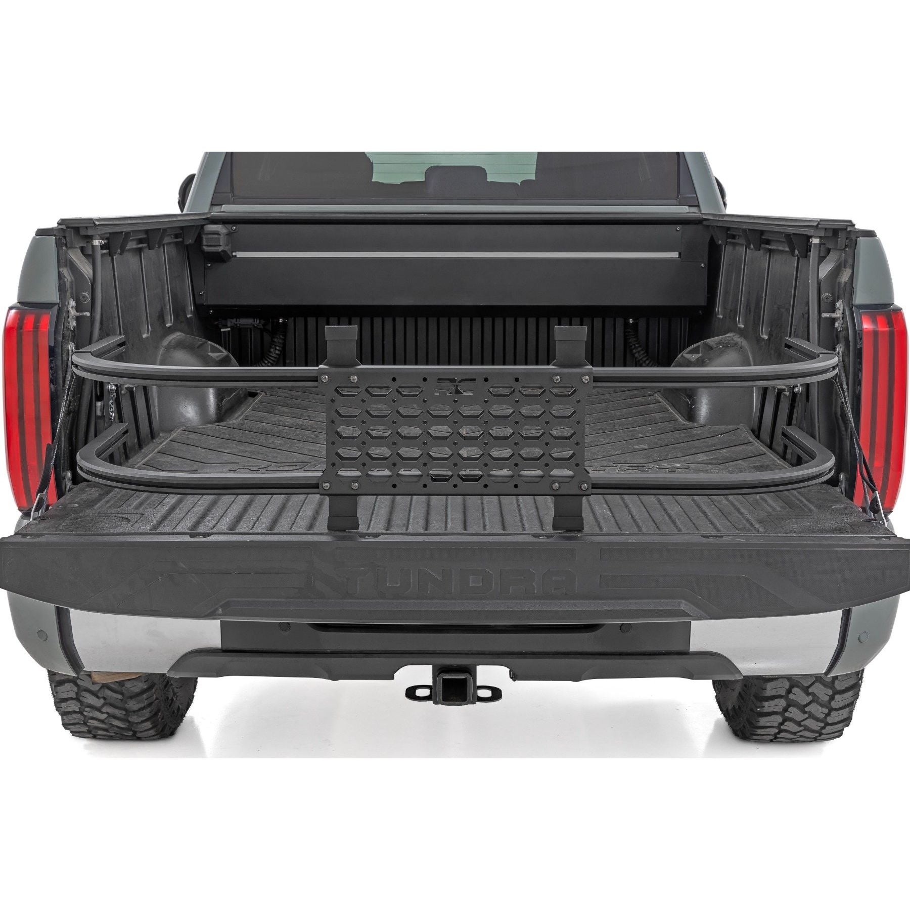 Maximize Your Truck's Potential with Rough Country's Bed Extender: Take your truck bed to the next level with Rough Country's heavy-duty Bed Extender. Engineered for performance, this versatile upgrade adds up to 26 inches of extended bed space, giving you the room you need for oversized cargo and weekend gear hauls.Two-in-One Functionality: Need extra length or secure containment? This dual-function design works as a traditional extender or flips inward to form a cargo enclosure, keeping smaller items in place while you ride.Built for Real-World Use: Crafted from high-strength materials with a durable black-coated finish, this extender stands up to the elements and resists corrosion for long-lasting use in rugged conditions.Adjustable Fit for Versatile Beds: Designed to fit bed openings from 55 to 64.5 inches, it offers wide-ranging compatibility for today's most popular truck models.Fully Equipped for Adventure: The integrated T-rail system provides flexible mounting for tie-downs and gear, while the MOLLE panel compatibility lets you organize tools and trail essentials with ease.Whether you're working hard or playing harder, Rough Country's Bed Extender gives your truck the edge it needs. Durable Black-Coated Finish: High-strength construction with a corrosion-resistant black coating for long-lasting performance.