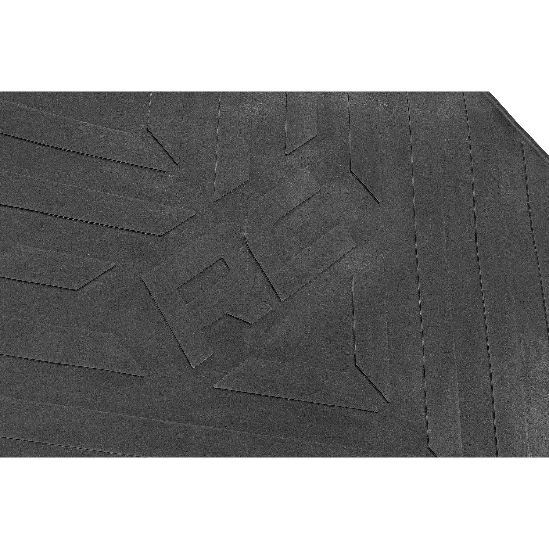 Innovative Design and Material. Keep your truck bed free from scuffs, scrapes, and scratches with Rough Country Truck Bed Mats. These heavy-duty, 3/8-inch thick, contoured rubber mats are nearly indestructible; made from a high-quality rubber compound that wonΓÇÖt crack in extreme temperatures or fade when exposed to the sun. This stylized bed mat features a large "RC" and "Rough Country" logo with angled lines for an improved look that also protects your truck bed.
