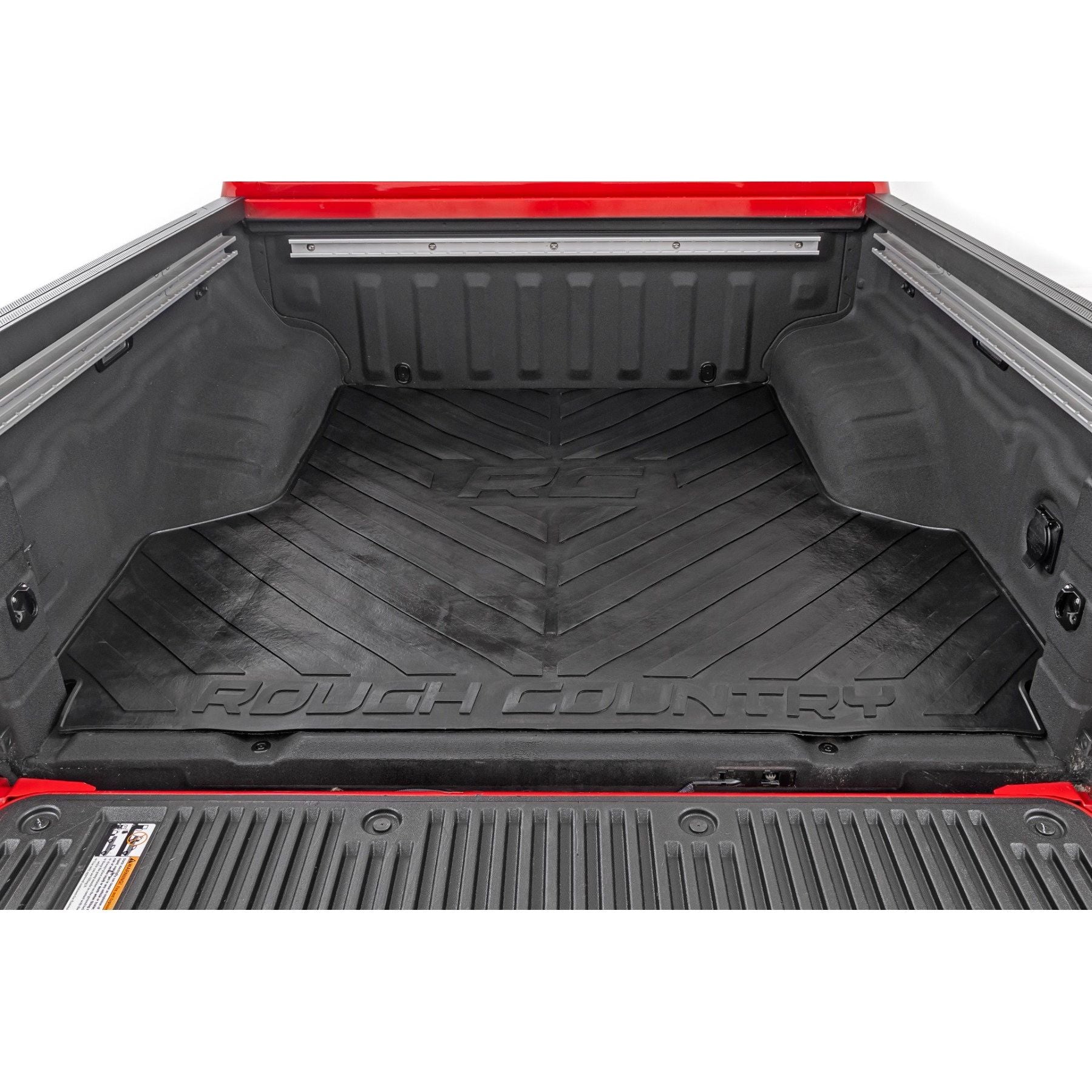 Innovative Design and Material. Keep your truck bed free from scuffs, scrapes, and scratches with Rough Country Truck Bed Mats. These heavy-duty, 3/8-inch thick, contoured rubber mats are nearly indestructible; made from a high-quality rubber compound that wonΓÇÖt crack in extreme temperatures or fade when exposed to the sun. This stylized bed mat features a large "RC" and "Rough Country" logo with angled lines for an improved look that also protects your truck bed.