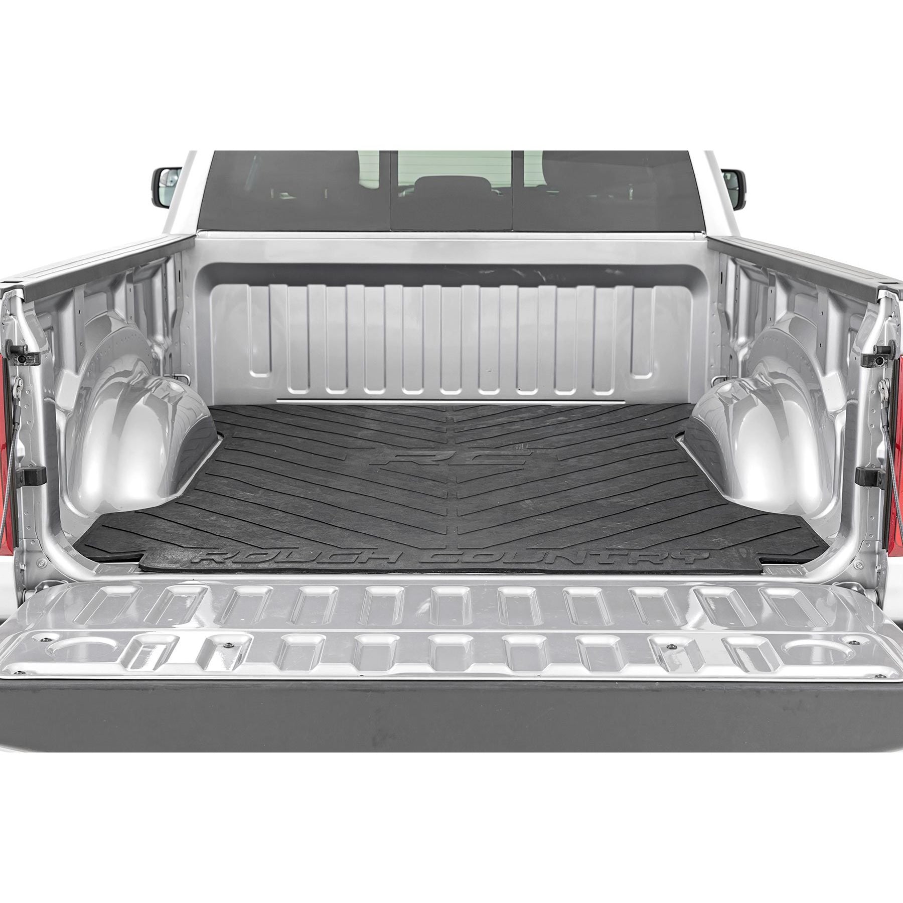 Innovative Design and Material. Keep your truck bed free from scuffs, scrapes, and scratches with Rough Country Truck Bed Mats. These heavy-duty, 3/8-inch thick, contoured rubber mats are nearly indestructible; made from a high-quality rubber compound that wonΓÇÖt crack in extreme temperatures or fade when exposed to the sun. This stylized bed mat features a large "RC" and "Rough Country" logo with angled lines for an improved look that also protects your truck bed.