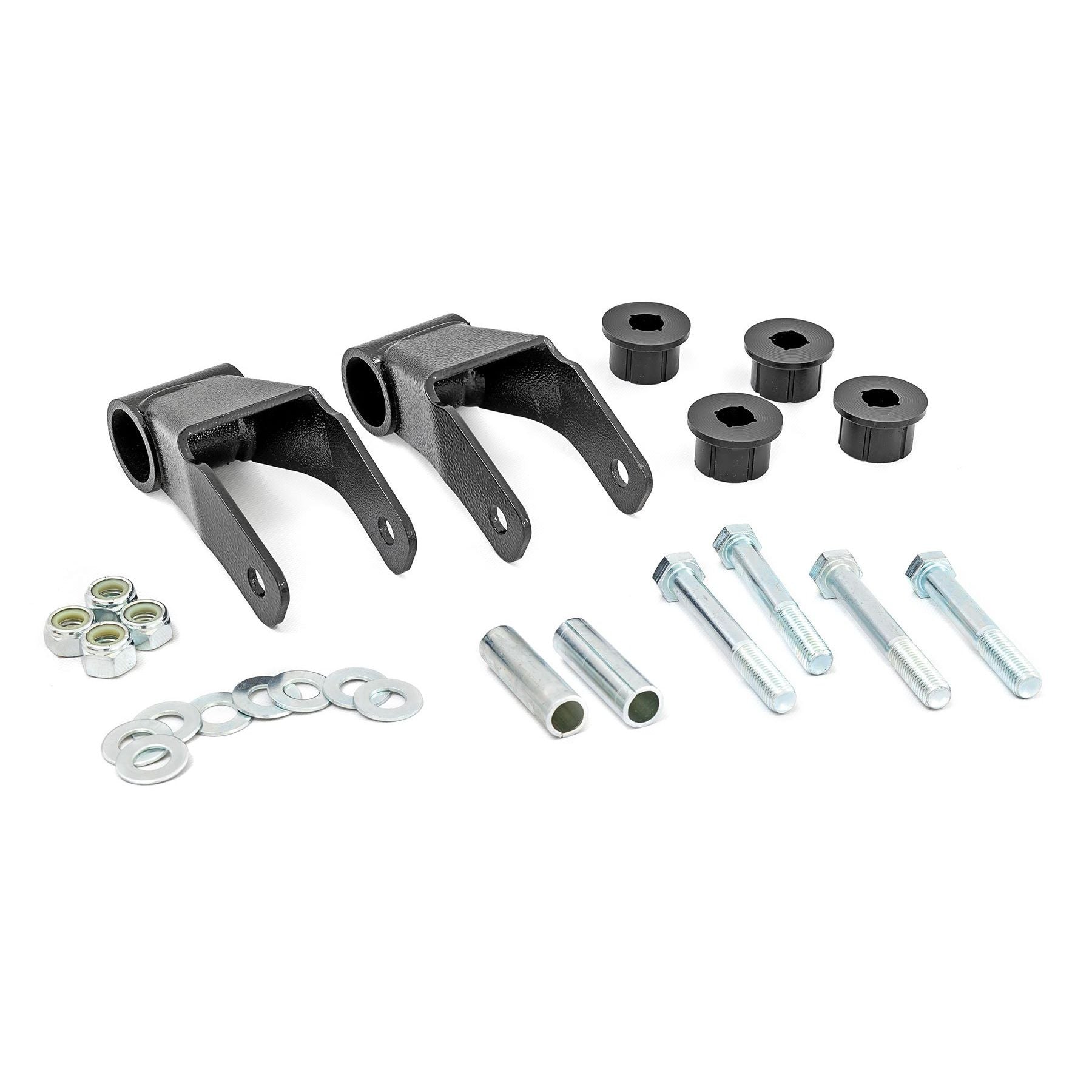Our lift shackles are constructed of 3/8in thick steel. All corners are rounded to avoid interference problems. New grade 8 hardware is included with each shackle lift, along with detailed instructions. Sold in Pairs. Easy bolt-on installation.