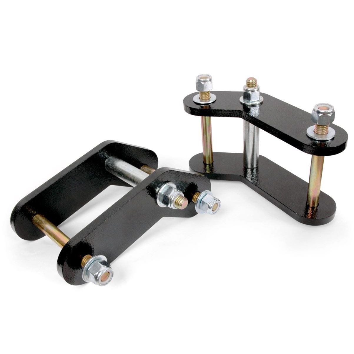 Our lift shackles are constructed of 3/8in thick steel. All corners are rounded to avoid interference problems. New grade 8 hardware is included with each shackle lift, along with detailed instructions. Sold in Pairs. Easy bolt-on installation.