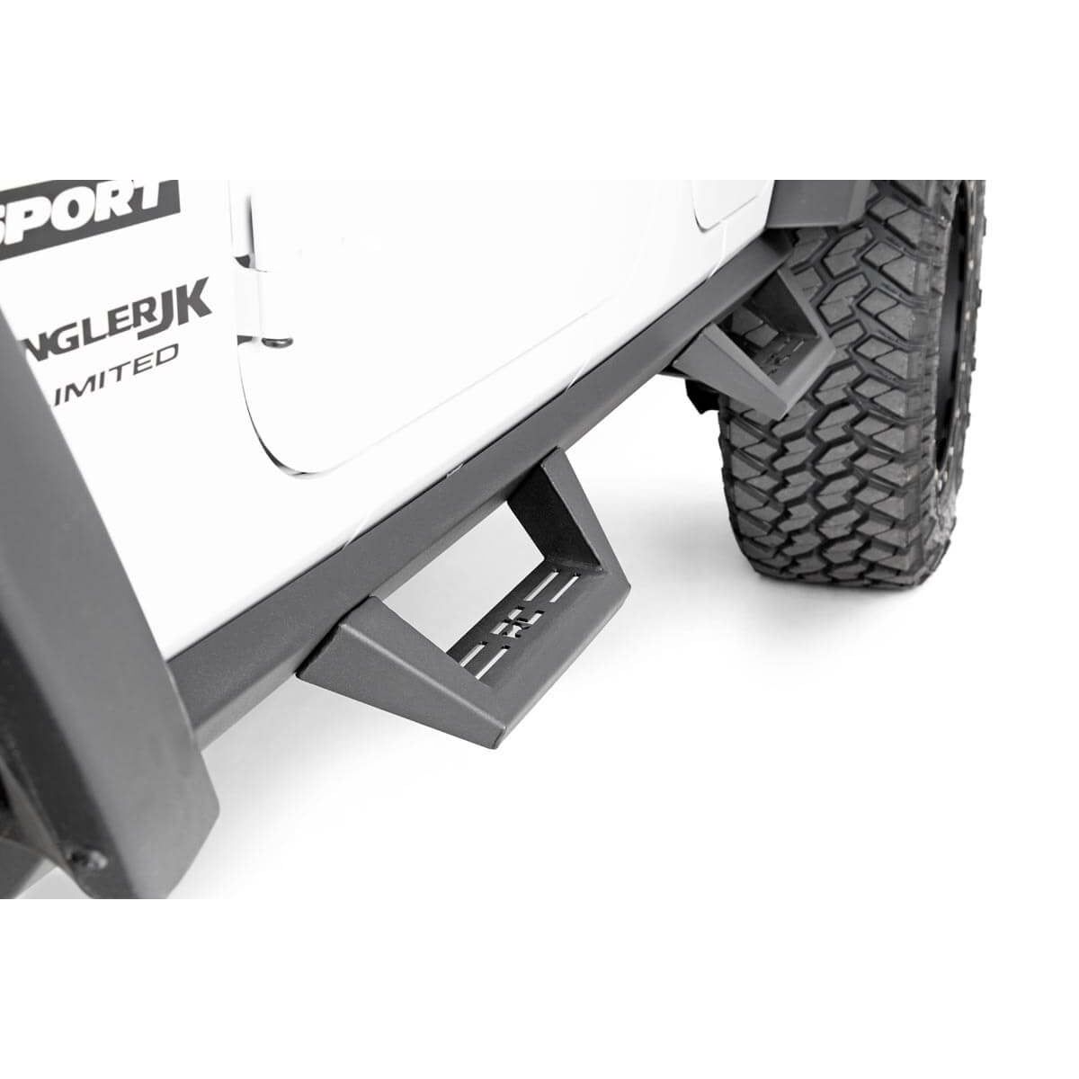 Get a one-of-a-kind, unique look for your Jeep JK with Rough Country Contoured Drop Steps. These stylish wheel-to-wheel steps offer a unique look for your vehicle, with two integrated drop steps to help you easily climb into your cab.This step was engineered with a discrete, contoured design to perfectly complement the body lines of your Jeep JK, offering a tight, flush fit that looks good enough to be a factory option!Each integrated step is fabricated for strength and durability, and features a laser cut, accented ΓÇ£RCΓÇ¥ logo for a one-of-a-kind look and feel.These durable steel steps offer unrelenting reliability, and are powdercoated black to resist corrosion for a long life of great looks. Rough Country Steps include a Lifetime Replacement Warranty!