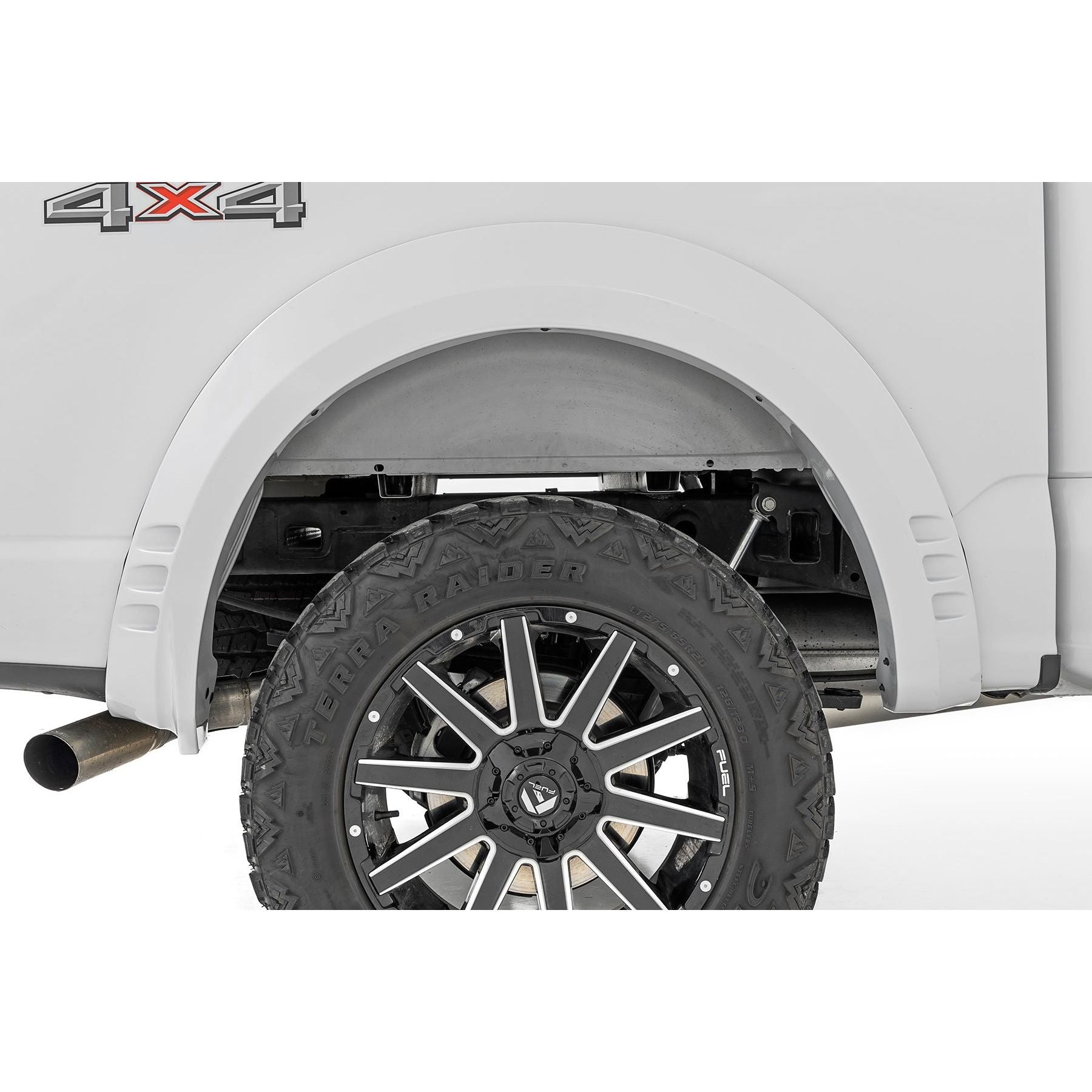 Protect your truck in style. Nothing turns heads like the style of your Ford F-150, so why not give it a little extra attitude with Rough Country's SF1 Fender Flares? Not only do they give your vehicle an awesome, simulated riveted look, but they also provide additional protection from rocks and mud. Plus, they offer maximum tire coverage and look great on lifted trucks. And best of all, they're easily paintable to color-match your truck. So, gear up and roll with style with Rough Country's SF1 Fender Flares!