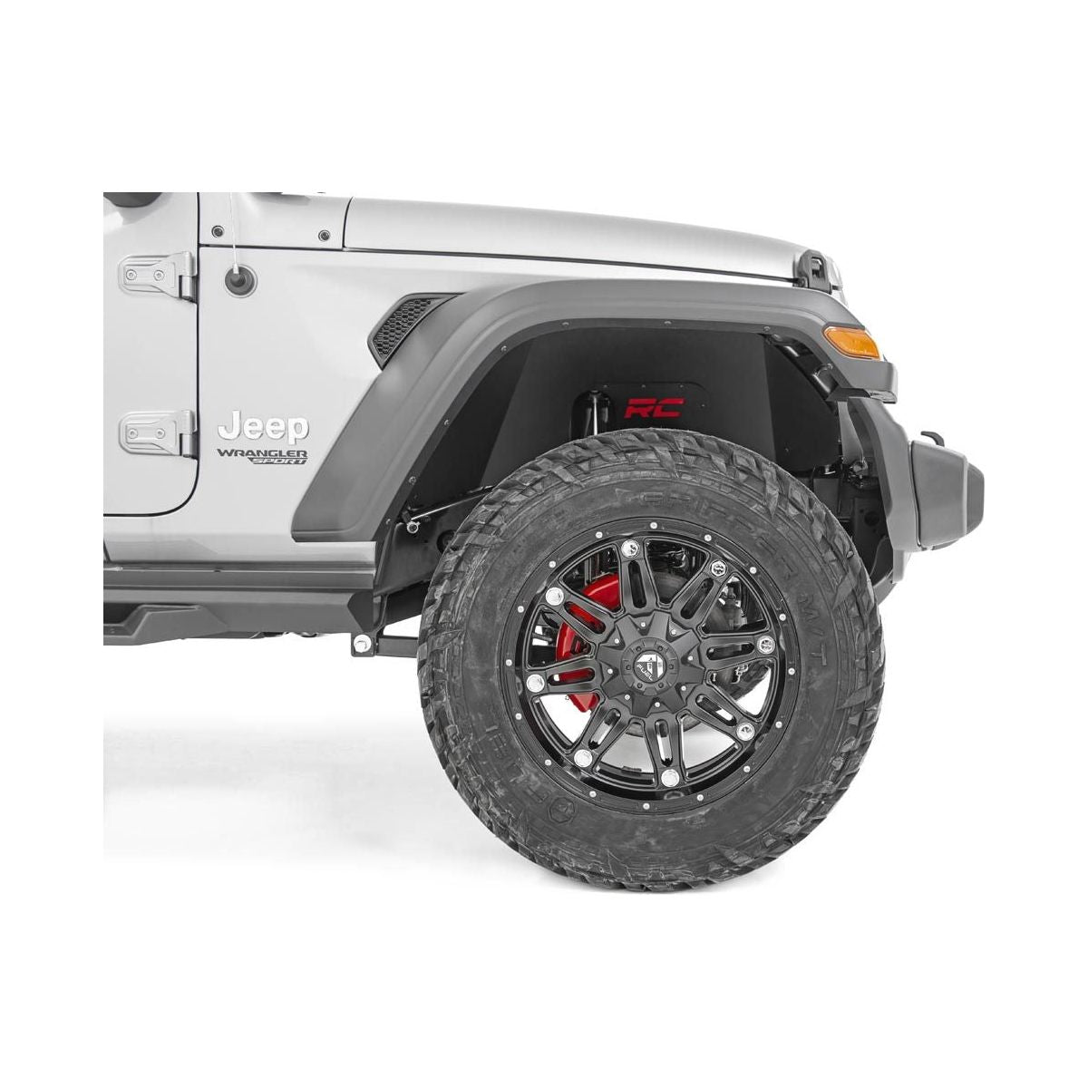 If using stock wheels a wheel spacer MUST be used for adequate clearance. I Clean up the look of your inner fenders when using aftermarket flares with Rough Country’s JL Front and Rear Inner Fender Liners. These eye-catching inner fender upgrades help protect sensitive areas from dust, mud, and debris, and can be easily installed in no-time flat!