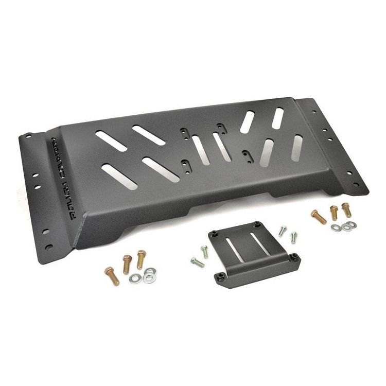 Rubicon models require compressor relocation bracket. (#1123) I Put the shovel to rest with Rough Country's new High Clearance Skid Plate. Made from heavy-duty quarter inch steel, this super tough belly pan protects the underside of your vehicle from off-road hazards. With its innovative design the skid plate sits snug to the vehicle, avoiding hang-ups your factory plate can't and allowing an additional 2in of clearance. The pronounced lip traverses rocks and dirt with ease. A powdercoat helps ward off the elements as well as it gives the vehicle a killer look.