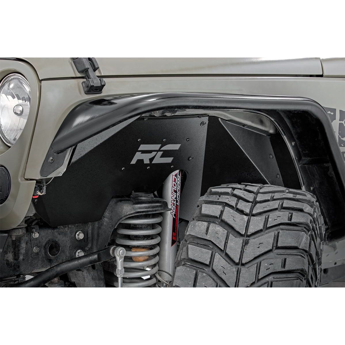 Clean up the look of your inner fenders when using aftermarket flares with Rough Country JK Front Inner Fender Liners. This eye-catching inner fender upgrade helps protect your engine bay from dust, mud, and debris, and can be easily installed in no-time flat!Aftermarket fenders are a huge improvement for most Jeeps wanting to get the best clearance and articulation possible, but when removing the stock fenders many people also remove the stock fender liners. Regain protection in this crucial area and protect your engine bay from the elements with Rough Country innovative Front Inner Fender Liners. With a unique 3-piece construction, these liners cover more areas than other liners on the market, giving more protection to your engine bay and body panels. Each Rough Country liner features a corrosion-resistant powder coat for long-lasting durability. Additionally, these liners mount firmly to the body for quiet operation, free of rattling or vibration noise.The solid-steel, angular design with ΓÇÿRCΓÇ¥ logo cutout gives an aggressive look to this now more visible area on your JK. An included, removable logo plate can be custom painted to any color you wish for a pop of extra color. Rough Country Inner Fender Liners feature a bolt-on installation process with minor drilling for an easy upgrade you can do with common tools in a home garage. Includes Rough Country Lifetime Replacement Warranty. 3-piece construction for total protection