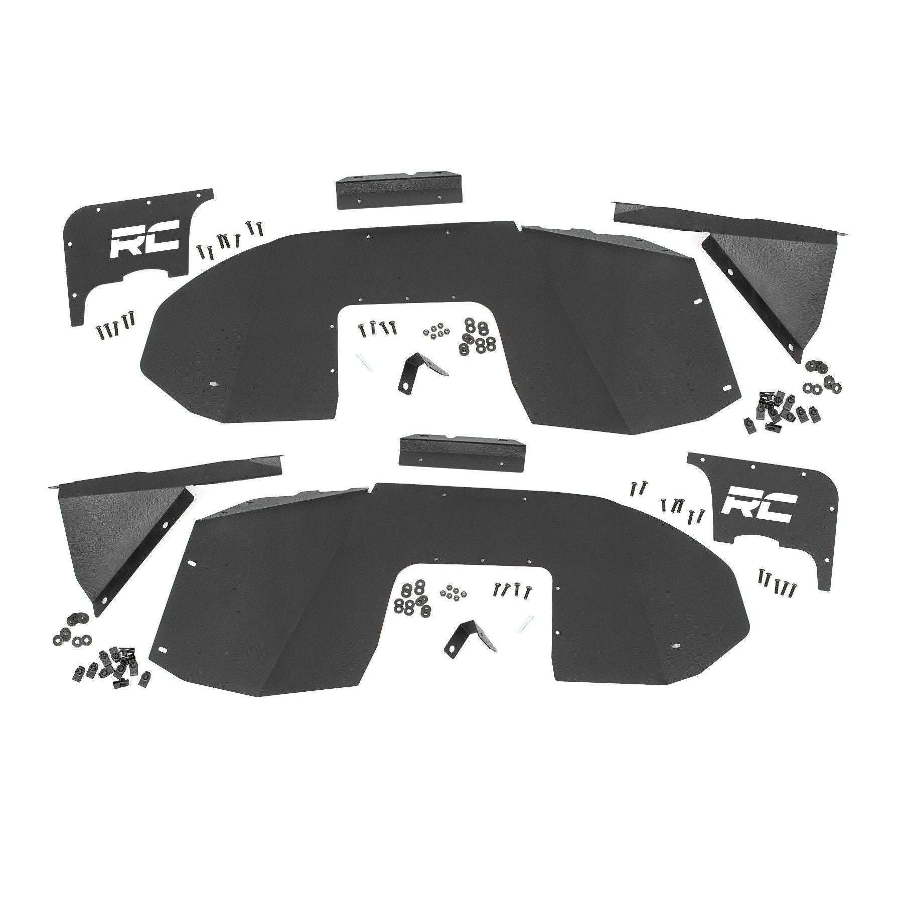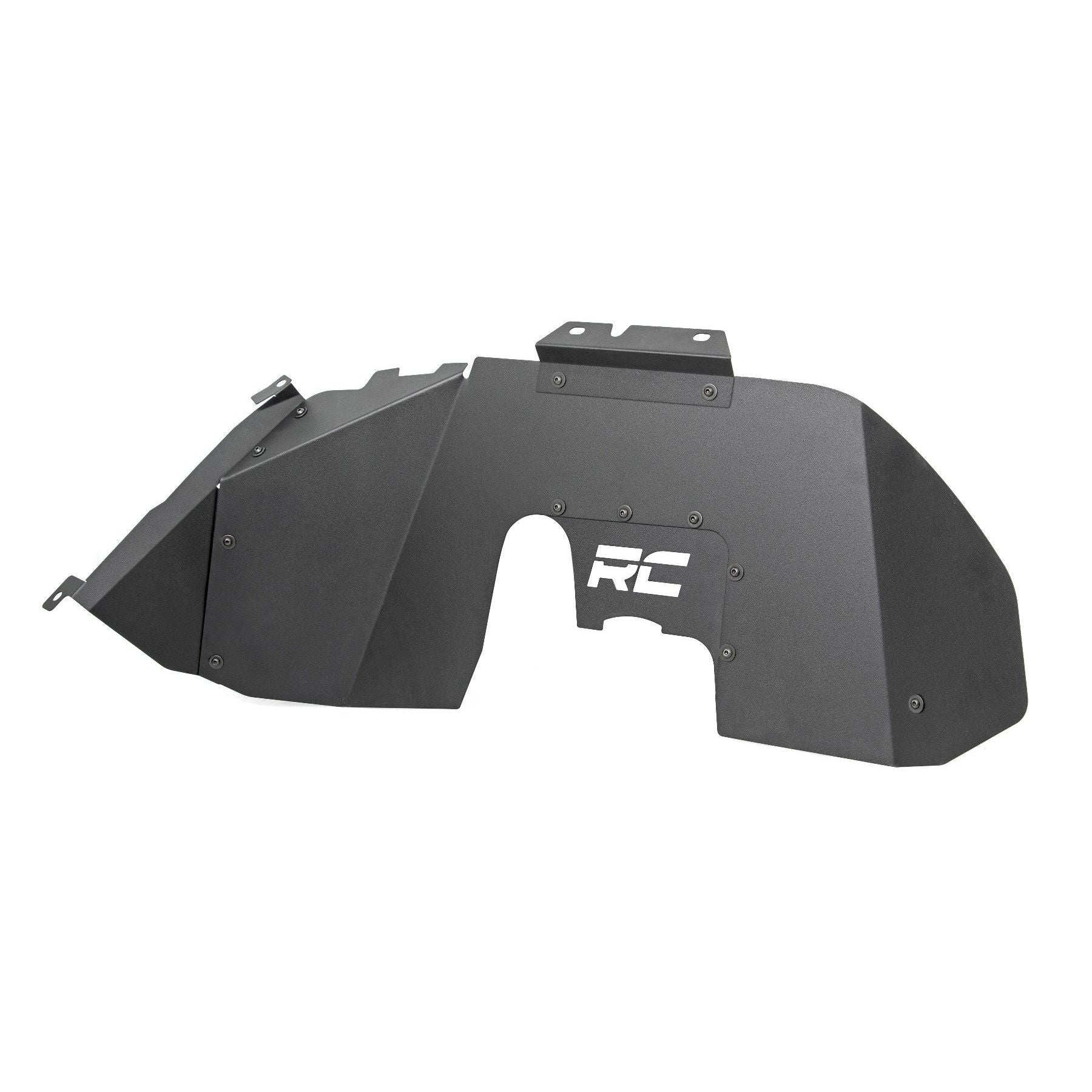 Clean up the look of your inner fenders with Rough Country JL Front Inner Fender Liners. This eye-catching inner fender upgrade helps protect your engine bay from dust, mud, and debris, and can be easily installed in no-time flat!Aftermarket fenders are a huge improvement for most Jeeps wanting to get the best clearance and articulation possible, but when removing the stock fenders many people also remove the stock fender liners. Regain protection in this crucial area and protect your engine bay from the elements with Rough Country innovative Front Inner Fender Liners. With a unique 3-piece construction, these liners cover more areas than other liners on the market, giving more protection to your engine bay and body panels. Each Rough Country liner features a corrosion-resistant powder coat for long-lasting durability. Additionally, these liners mount firmly to the body for quiet operation, free of rattling or vibration noise.The solid-steel, angular design with ΓÇÿRCΓÇ¥ logo cutout gives an aggressive look to this now more visible area on your JL. An included, removable logo plate can be custom painted to any color you wish for a pop of extra color. Rough Country Inner Fender Liners feature a bolt-on installation process with minor drilling for an easy upgrade you can do with common tools in a home garage. Includes Rough Country Lifetime Replacement Warranty. Keeps mud and debris out of engine bay