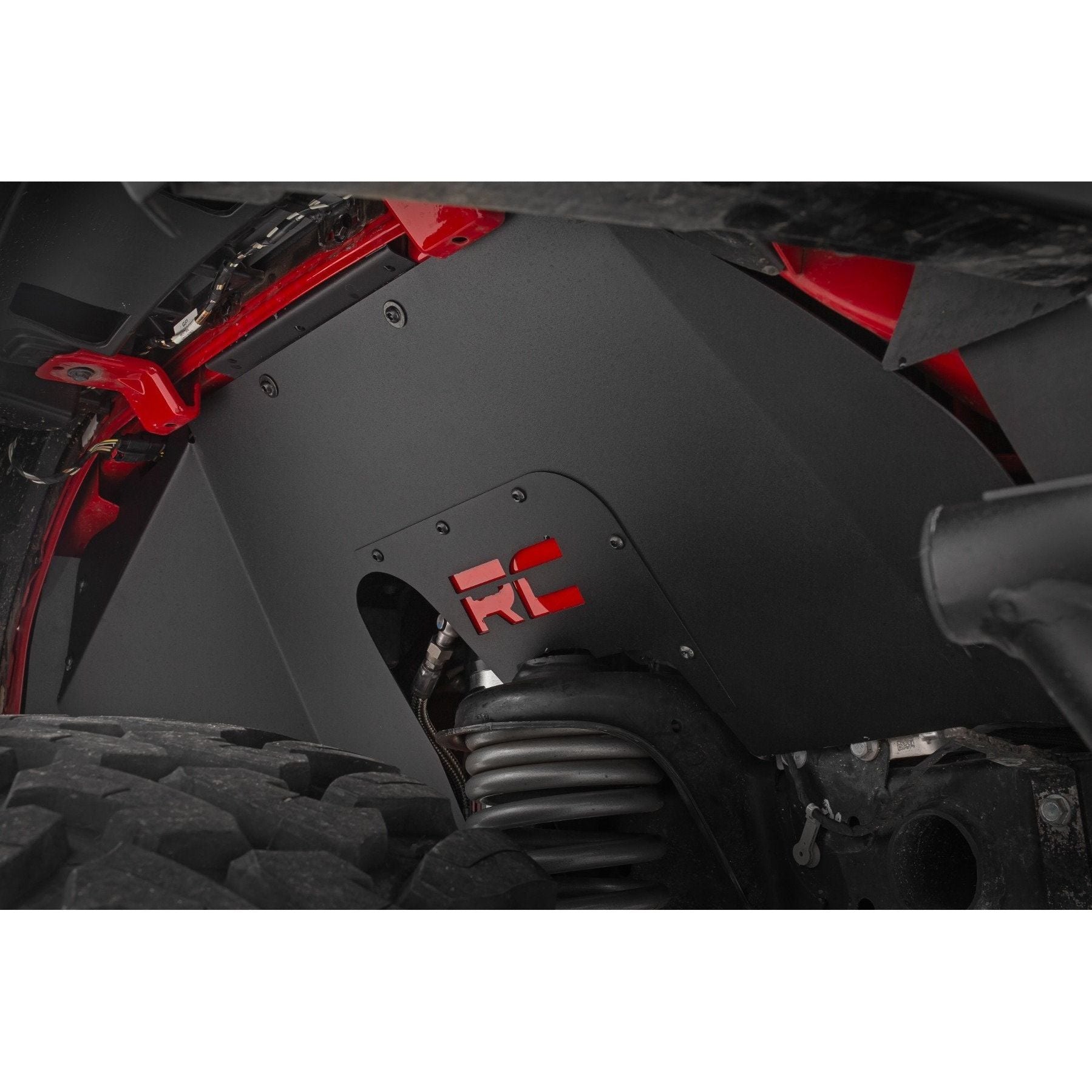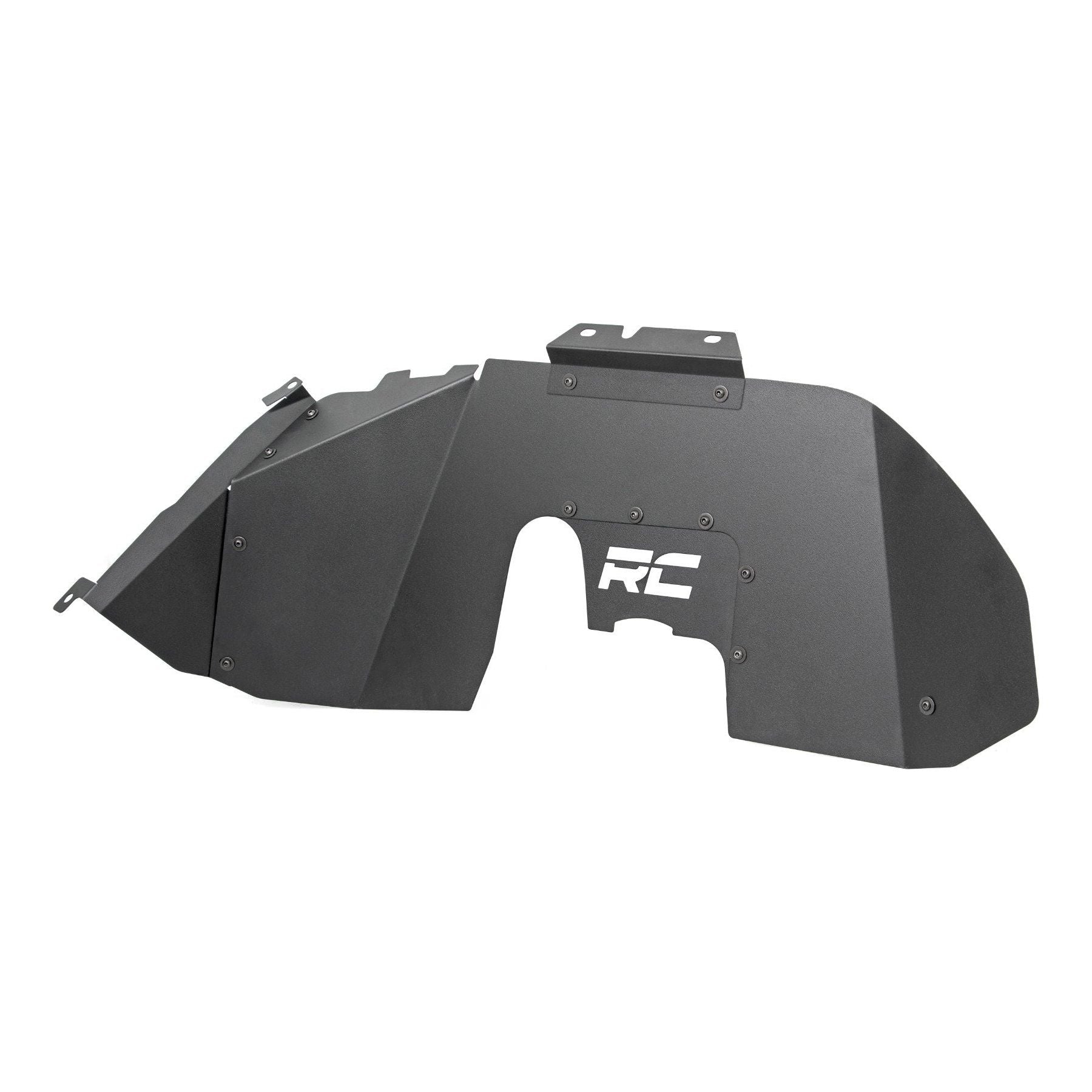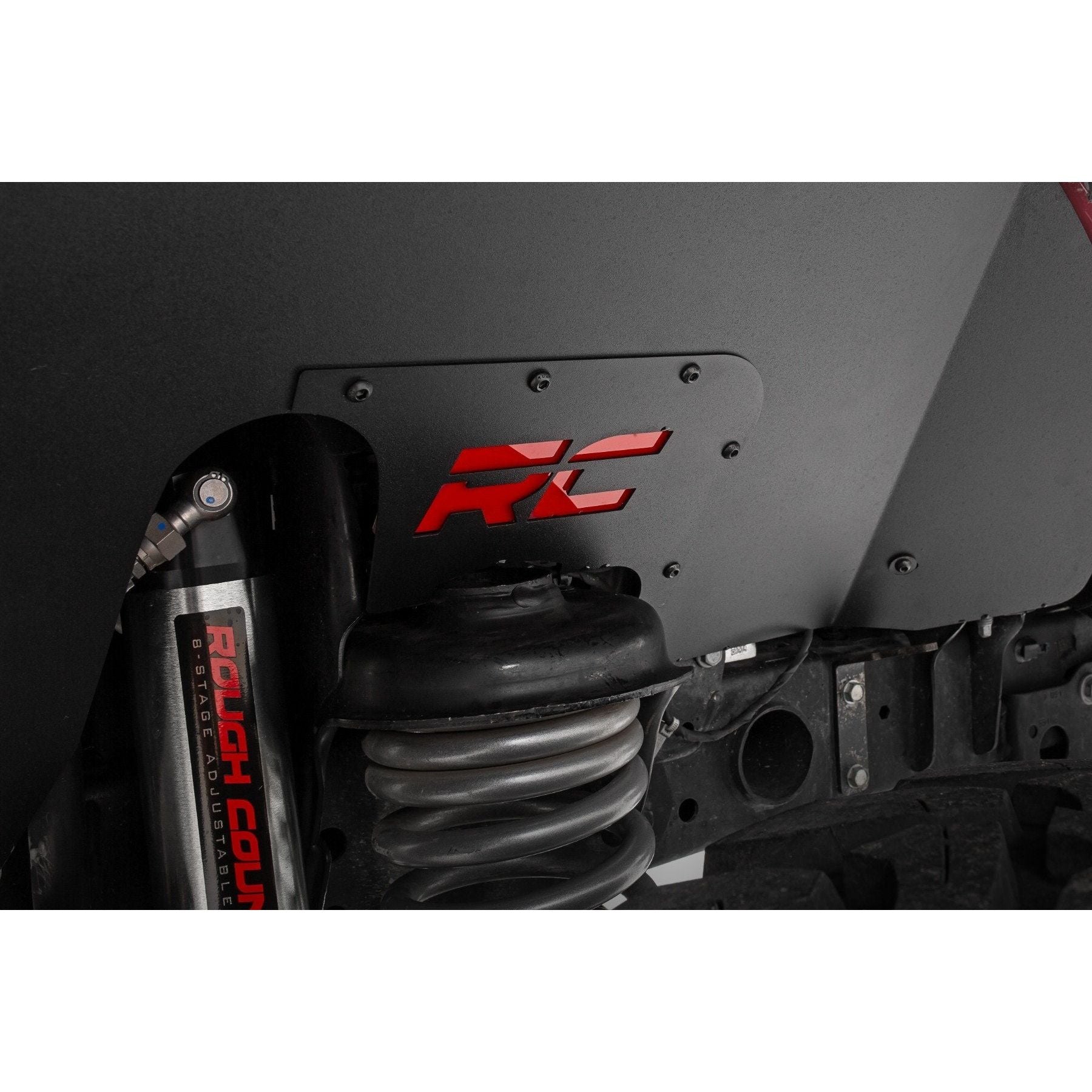 Durable Upgrade. Aftermarket fenders are a huge improvement for most Jeeps wanting to get the best clearance and articulation possible, but when removing the stock fenders many people also remove the stock fender liners. Regain protection in this crucial area and protect your engine bay from the elements with Rough Country’s innovative Front Inner Fender Liners. With a unique 3-piece construction, these liners cover more areas than other liners on the market, giving more protection to your engine bay and body panels. Each Rough Country liner features a corrosion-resistant powder coat for long-lasting durability. Additionally, these liners mount firmly to the body for quiet operation, free of rattling or vibration noise. The solid-steel, angular design with "RC” logo cutout gives an aggressive look to this now more visible area on your JT. An included, removable logo plate can be custom painted to any color you wish for a pop of extra color.