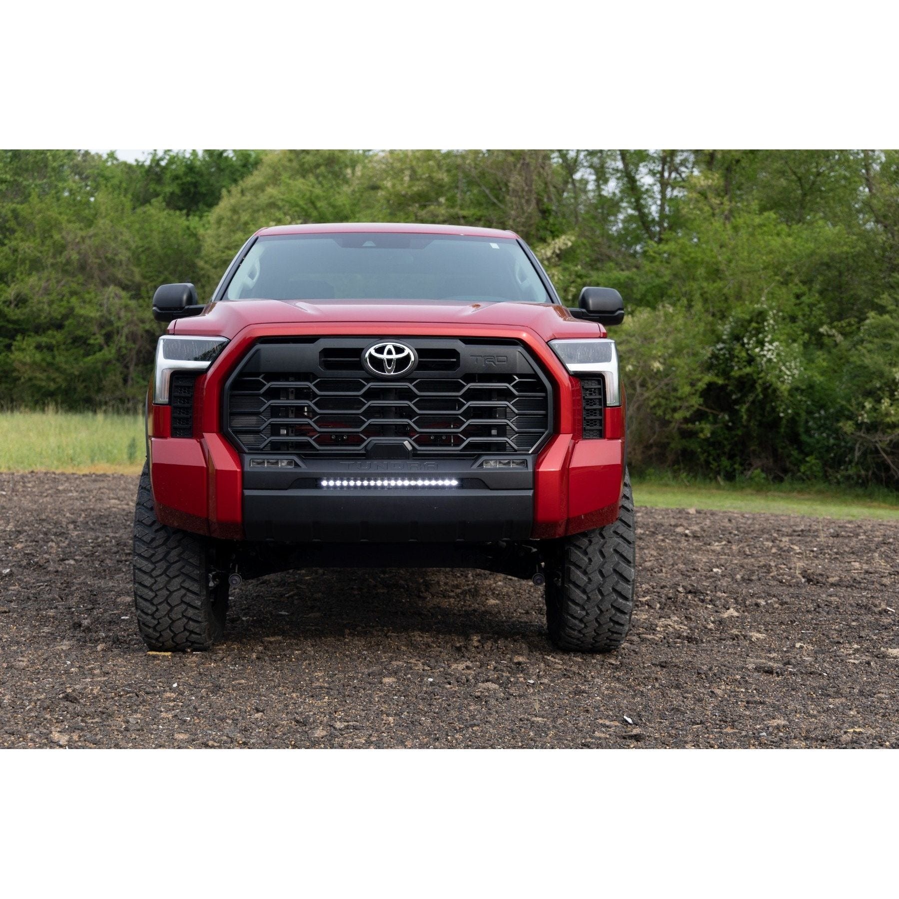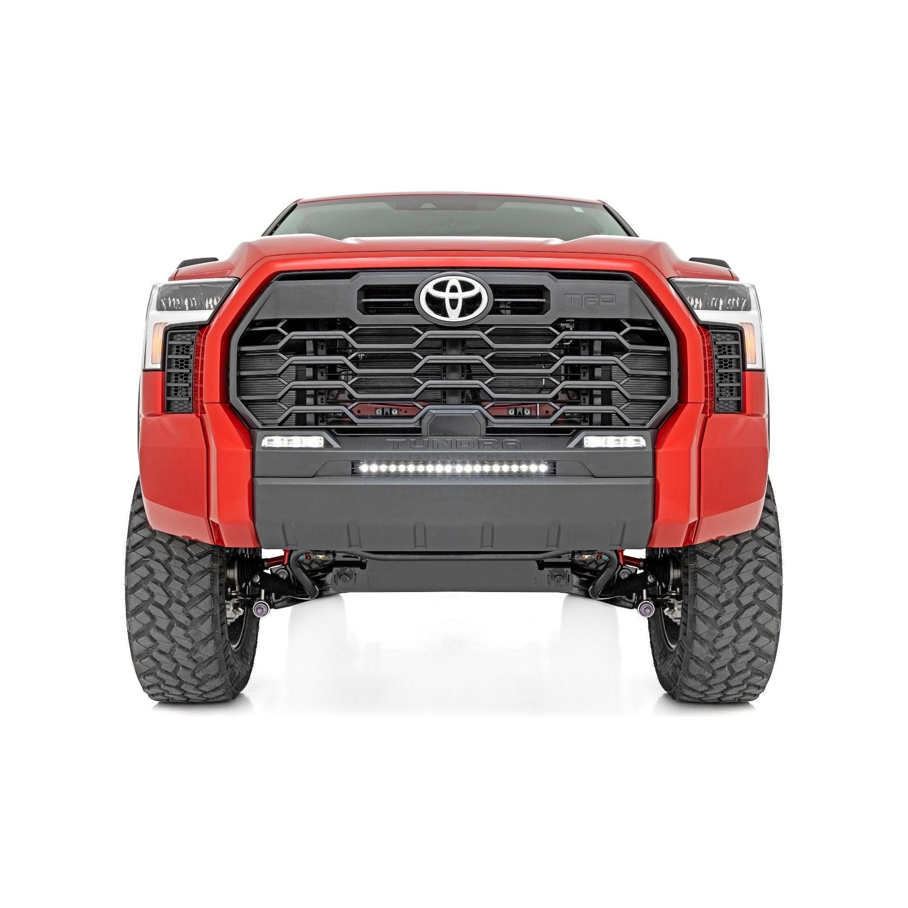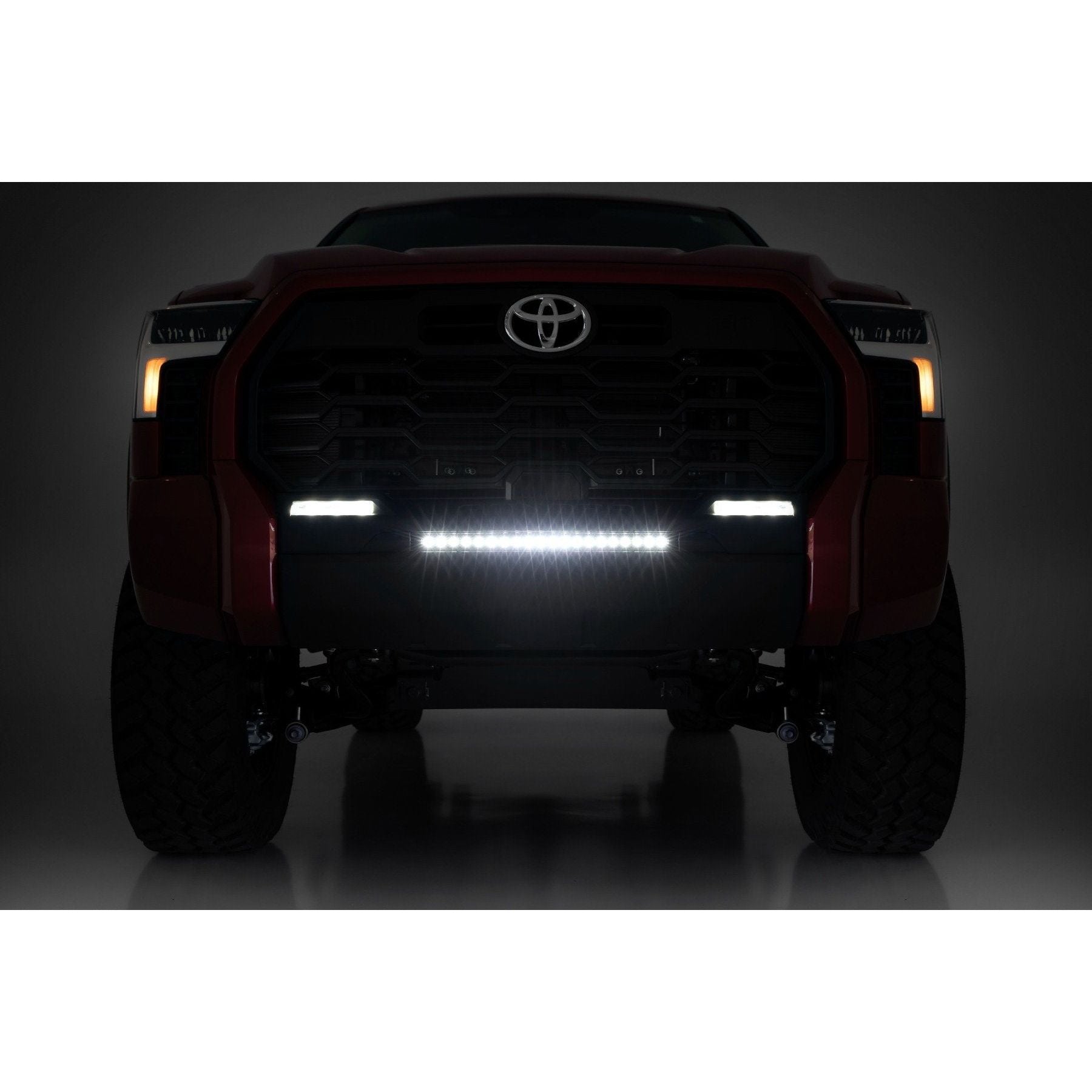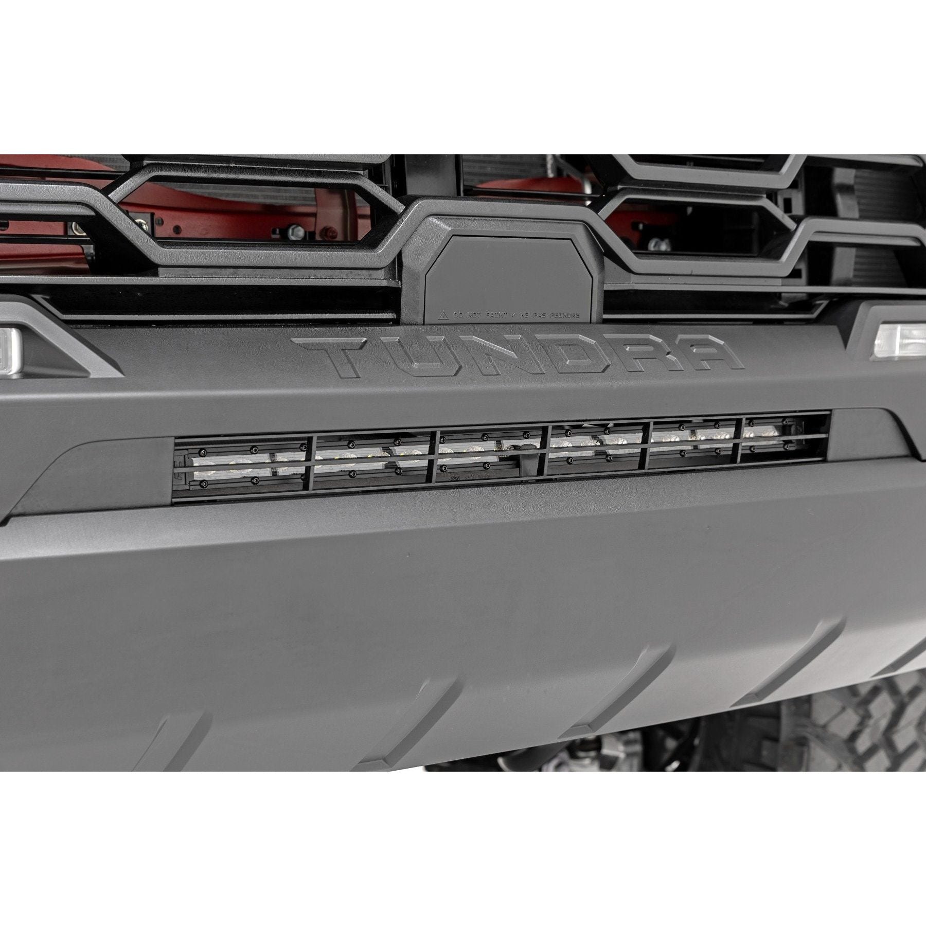 Command the Dark! Looking to add some serious illumination to your Tundra's front end? Check out the all-new 2022 Tundra 20-Inch Slim Line Grille Kit from Rough Country. This kit includes a 20-inch LED light bar, making it easy to add impressive lighting power to your vehicle. With 20, 5-watt high-intensity CREE LEDs, you'll have plenty of light to take on even the darkest trails. And the flood beam pattern provides a wide, evenly distributed beam of light that is perfect for off-road adventures. Best of all, thanks to the slimline design, this bumper kit maintains a factory-like appearance. So don't let the dark stop you from exploring - get your hands on the Rough Country 2022 Tundra 20-Inch Slim Line Bumper Kit today!