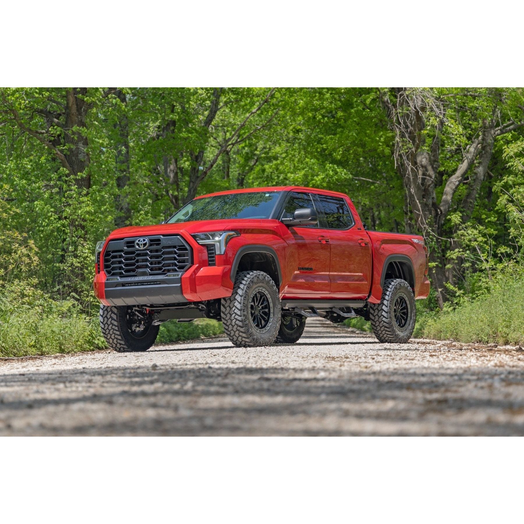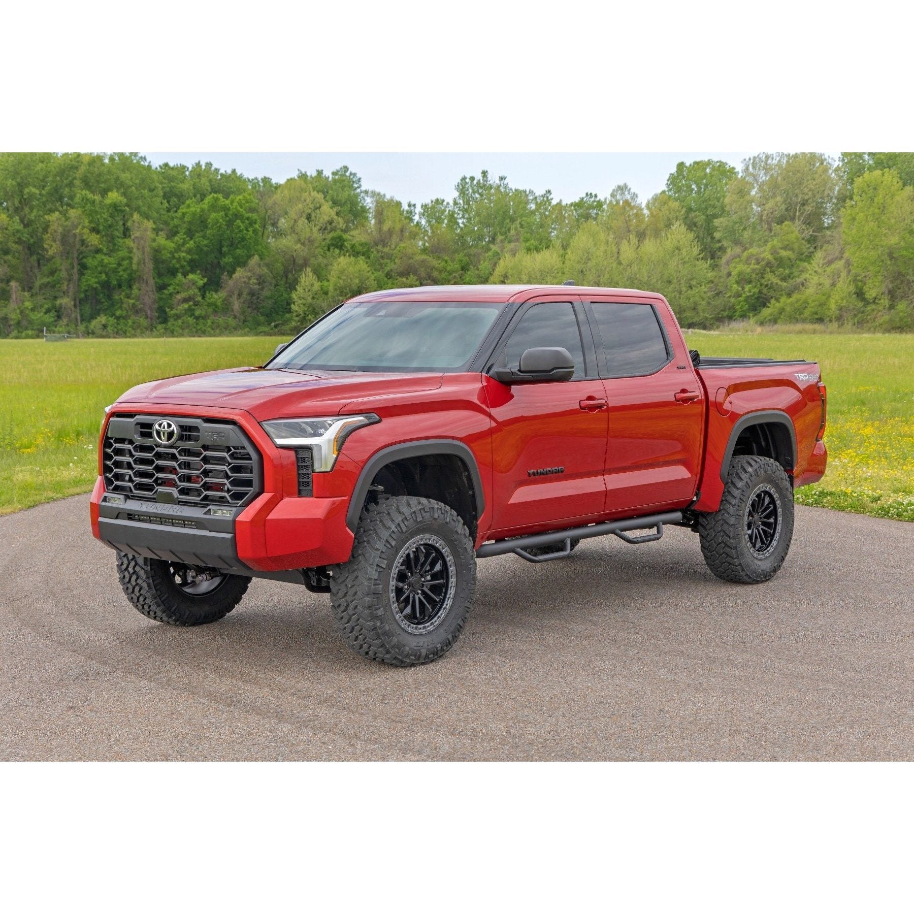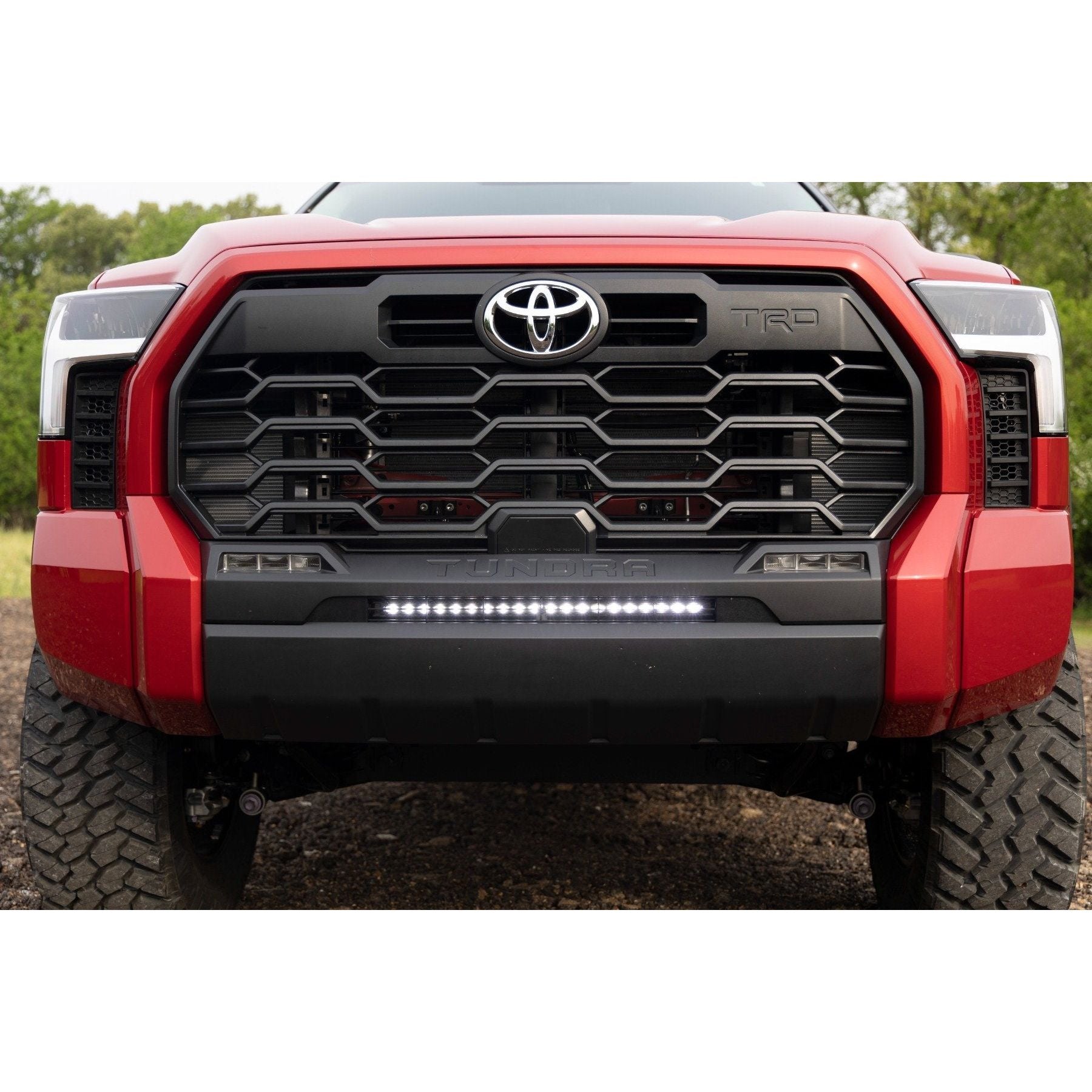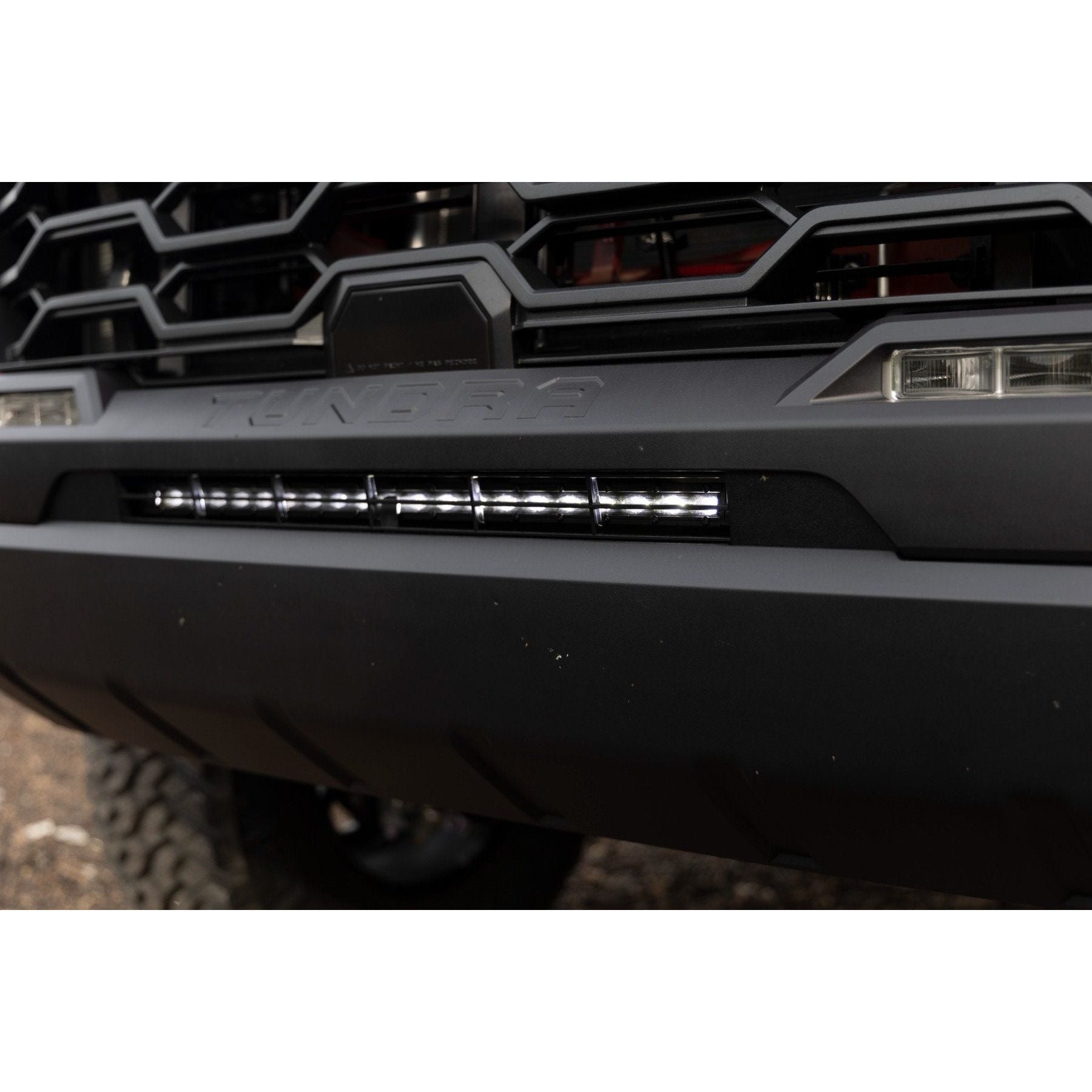 Command the Dark! Looking to add some serious illumination to your Tundra's front end? Check out the all-new 2022 Tundra 20-Inch Slim Line Grille Kit from Rough Country. This kit includes a 20-inch LED light bar, making it easy to add impressive lighting power to your vehicle. With 20, 5-watt high-intensity CREE LEDs, you'll have plenty of light to take on even the darkest trails. And the flood beam pattern provides a wide, evenly distributed beam of light that is perfect for off-road adventures. Best of all, thanks to the slimline design, this bumper kit maintains a factory-like appearance. So don't let the dark stop you from exploring - get your hands on the Rough Country 2022 Tundra 20-Inch Slim Line Bumper Kit today!