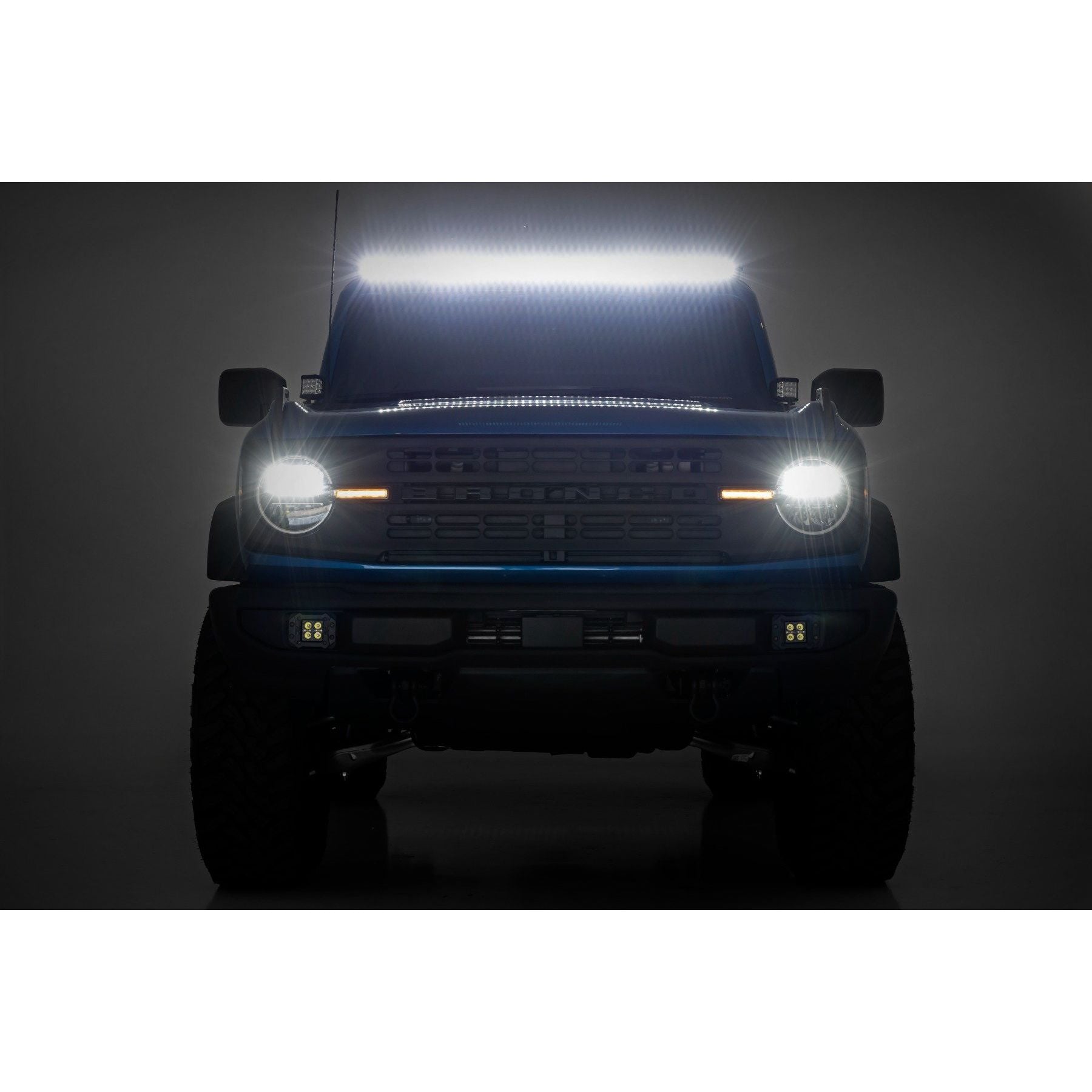 Take to the trails with Rough Country's forward facing 50" LED kit. This modern solution is the perfect accessory to provide a staggering 19,200 lumens of bold illumiation to the the redefined Bronco. Featuring a sleek black panel design offering jaw-dropping good looks that blend perfectly with any vehicle using black accents like grilles, wheels, bull bars or steps!
