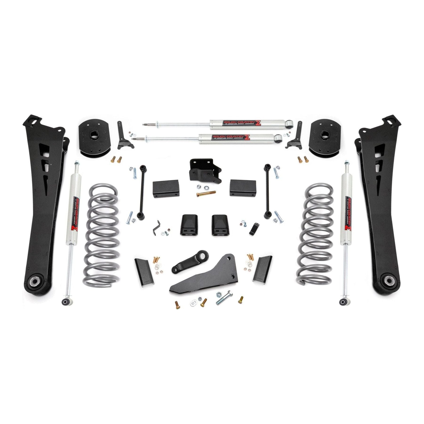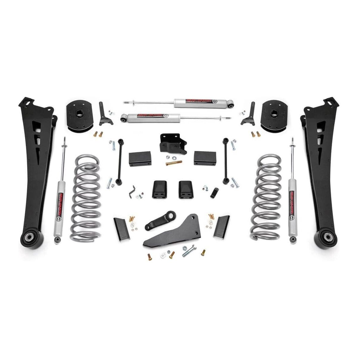 When changing a vehicle's suspension, the key to preserving ride quality is in keeping the geometry of all suspension components as close to their factory angles as possible. Rough Country's new 5-inch Suspension kit features a set of ultra-durable Radius Arms, precision fit to bolt right into the factory mounts for an easier install and a more factory-like angle. These beefy, upgraded Radius Arms also feature a durable, durable rubber bushings for maximum vibration absorption. This kit also includes a set of front, lifted coil springs for unparalleled ride quality from your lifted Dodge Ram.