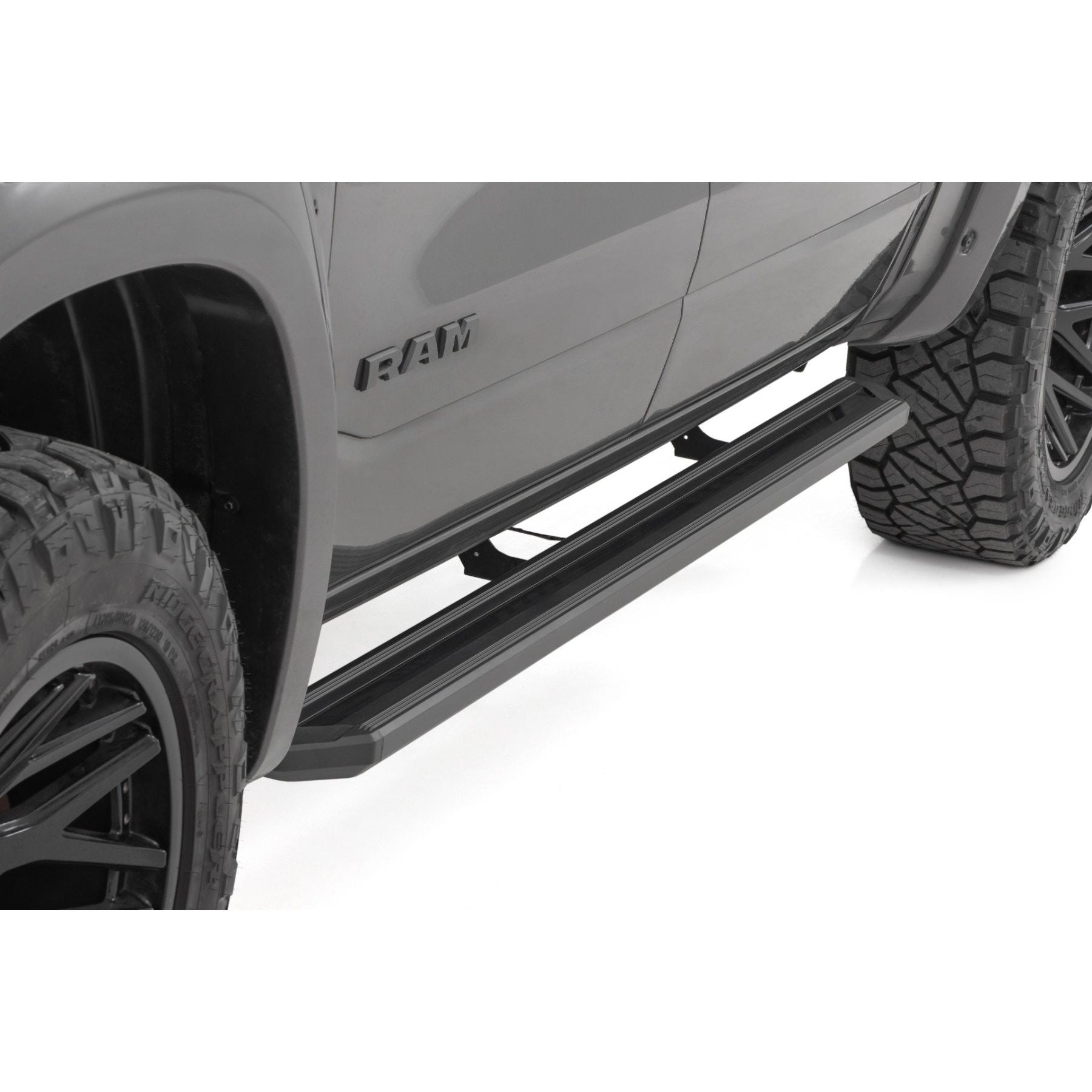 Revolutionize the way you step into your truck with Rough Country's Bluetooth-Controlled Running Boards! Designed for those who demand both cutting-edge technology and rugged durability, these premium running boards combine wireless convenience, customizable LED lighting, and rock-solid construction into one sleek package. Whether you're looking for enhanced accessibility, extra protection, or a bold new look, these running boards deliver the perfect blend of functionality and style-all at the touch of a button.Wireless Control at Your Fingertips: Step into the future with Bluetooth-controlled running boards that offer seamless access and fully customizable LED lighting. With a simple app-based control, you can adjust step settings and personalize lighting effects effortlessly.Built Tough with Premium Aluminum: Designed for durability, these one-piece aluminum running boards are lightweight, corrosion-resistant, and ready for any terrain. The sleek cab-length design provides full coverage while protecting your truck from road debris and rock chips.Custom Lighting Like Never Before: Express your style with 234 color options, 12 dynamic effects, and five preset color saves. The integrated LED strip and RC puddle lights enhance visibility for safer nighttime entry and exit, while the adjustable step lighting lets you set the perfect delay from 1 second to 10 minutes.Seamless Fit for Any Setup: Whether your truck has a body lift or not, these running boards are engineered for a perfect fit. The sleek frame coverage also conceals exposed components for a clean, factory-like finish.Easy, Bolt-On Installation: No need for complex modifications-these running boards feature a hassle-free, drill-free installation so you can get back on the road fast. Designed for convenience, strength, and style, they're the ultimate upgrade for your truck.Backed by Rough Country's Leading Warranty: With a Limited Lifetime Warranty, these running boards are built to last. Whether you're hitting the trails or cruising the streets, you'll have peace of mind knowing your investment is protected. Hassle-Free Bolt-On Install: No drilling required for a quick and easy setup.