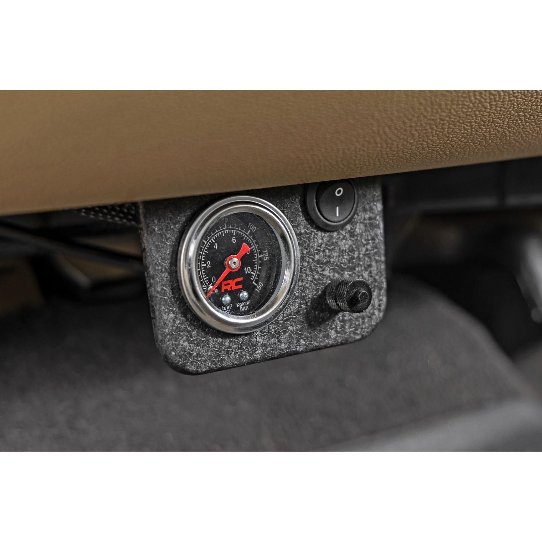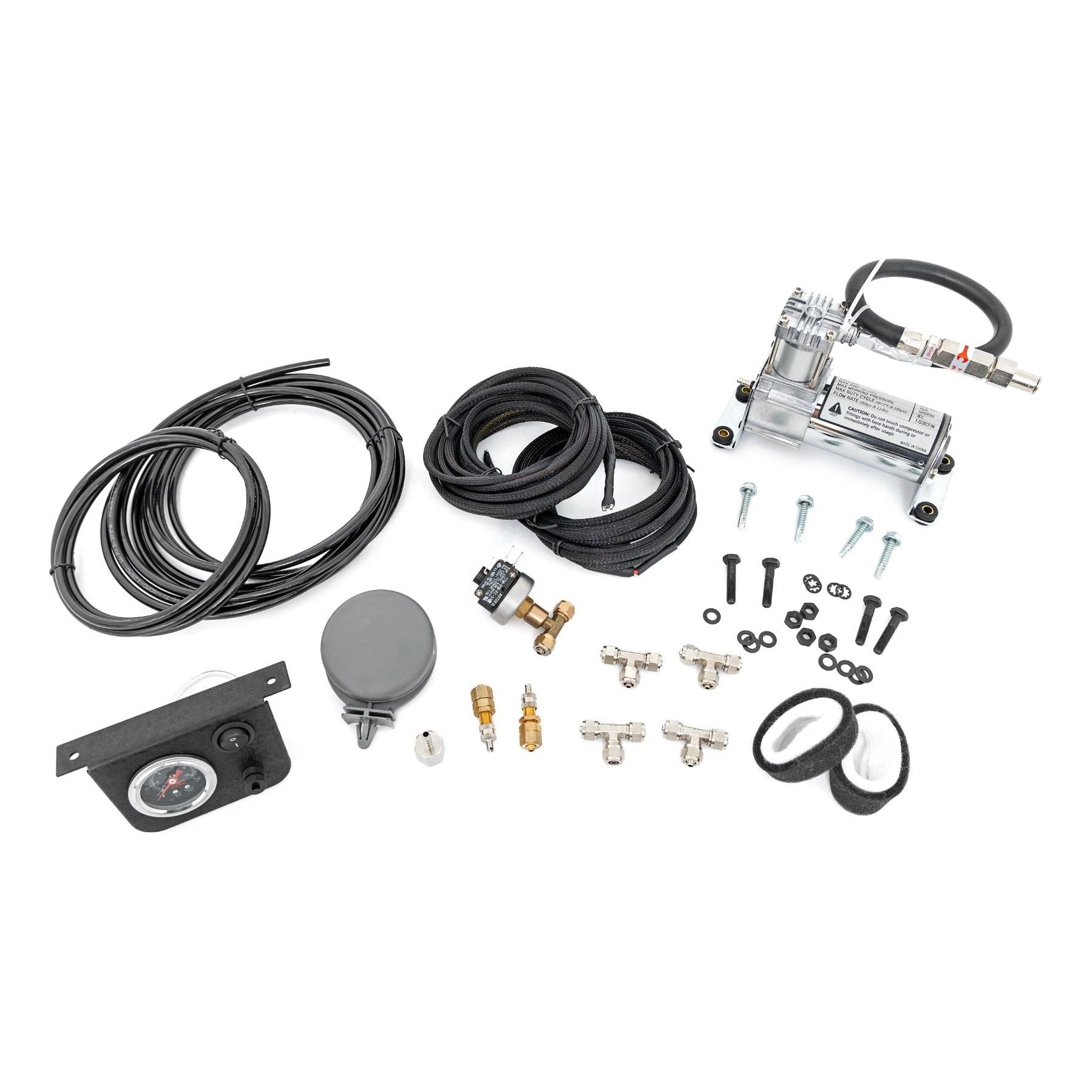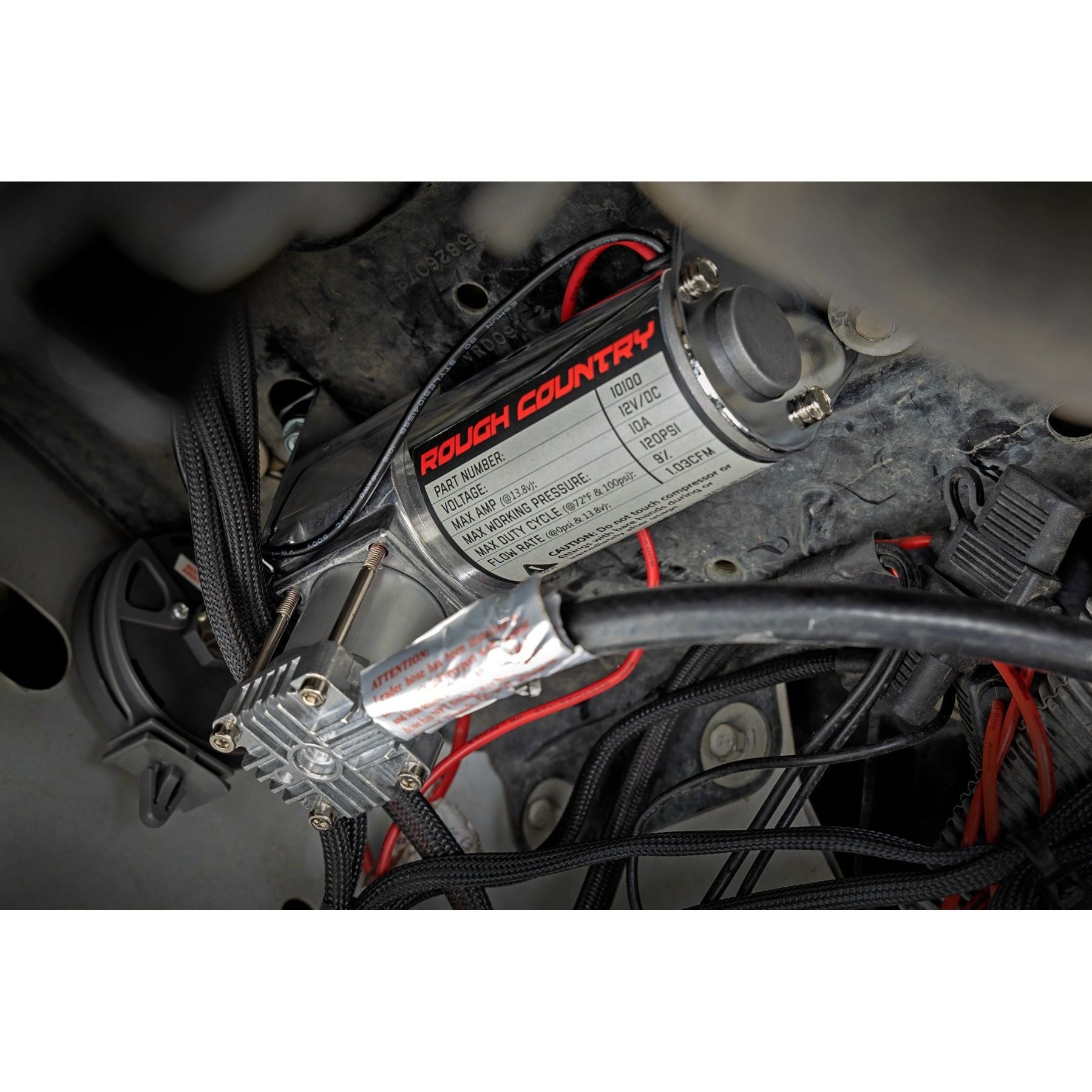 Heavy-Duty and Reliable. The Air Compressor Kit is moisture and dust-resistant, and it comes with a high-pressure leader hose. Our heavy-duty compressor has a recommended max working pressure of 120 PSI. In addition, it includes a gauge and all necessary wiring and air line to tie into your existing Rough Country Air Spring Kit. So, your vehicle's air springs can be adjusted at any time without having to look for an air source. And thanks to the low-pressure sensor, you can be sure that your air springs are always correctly inflated.