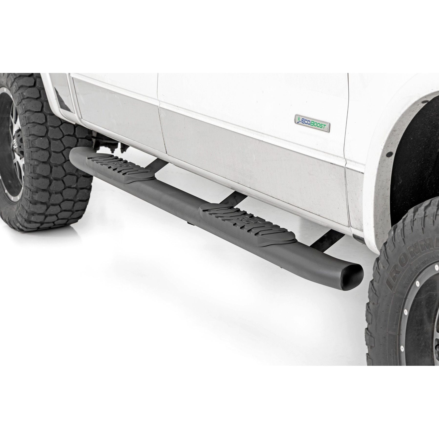 Step up your game. Give your Ford F-150 the perfect finishing touch with Rough Country's Oval Nerf Step Bars. They feature non-slip foot pads for secure footing with a classic OEM design that looks great on any F-150, including lifted models. These truck bed bars are designed for both form and function with a curved and stylish look.
