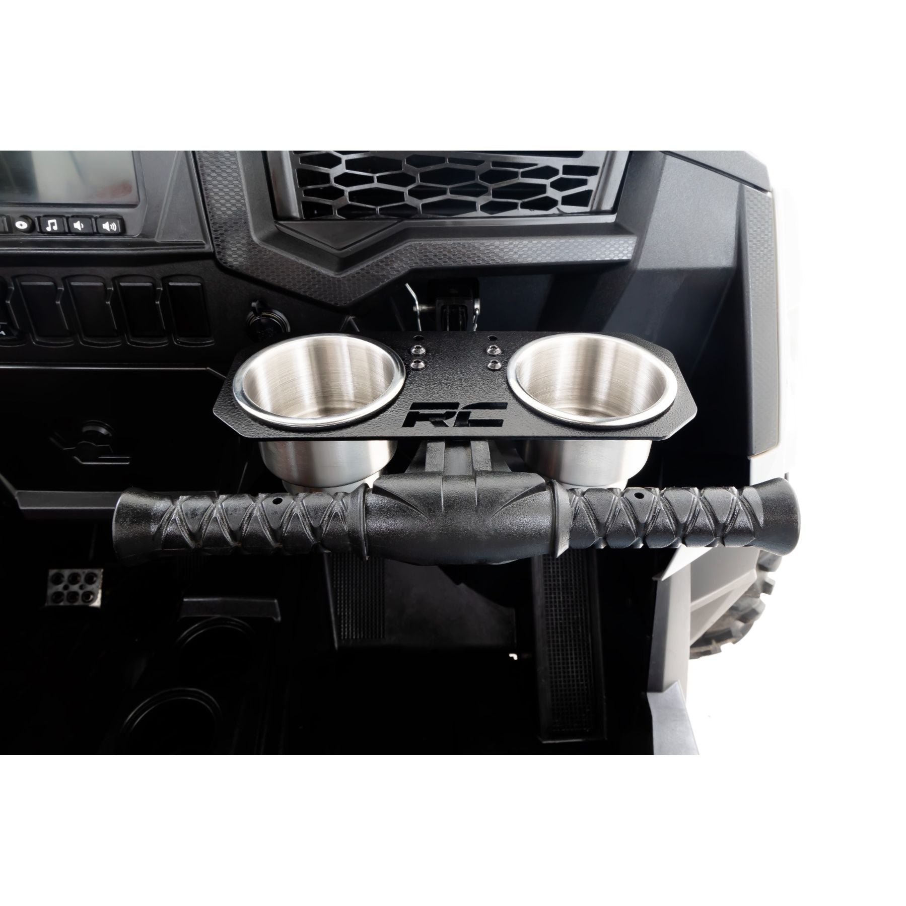 Innovative Upgrade. Fed up with drink spills while taking your Polaris Rzr off-road? Rough Country's Dual Cup Holder is the perfect solution. It attaches easily to the passenger grip handle, accommodating both cans and larger bottles. Crafted from durable 11ga steel with a tough powder coat finish, it's designed to withstand any rugged trail. With an easy, bolt-on installation youΓÇÖll be back to the trails in no time, all while your drinks stay right where they belong.