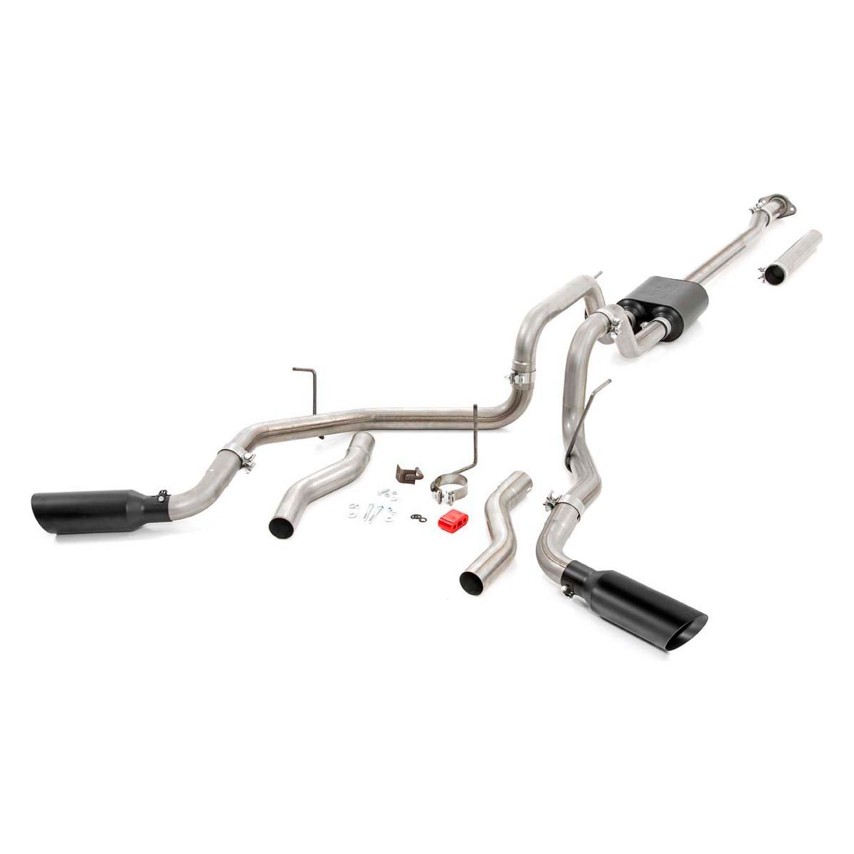 This part does not affect vehicle emissions and therefore is not covered by emissions regulations. I Give your truck an aggressive, throaty growl and killer good looks with Rough Country’s Dual Cat-Back Exhaust System for Ford F-150. These durable exhaust systems are fine tuned to improve air flow and deliver and the perfect aftermarket exhaust note that will put a smile on your face every time you hit the gas.