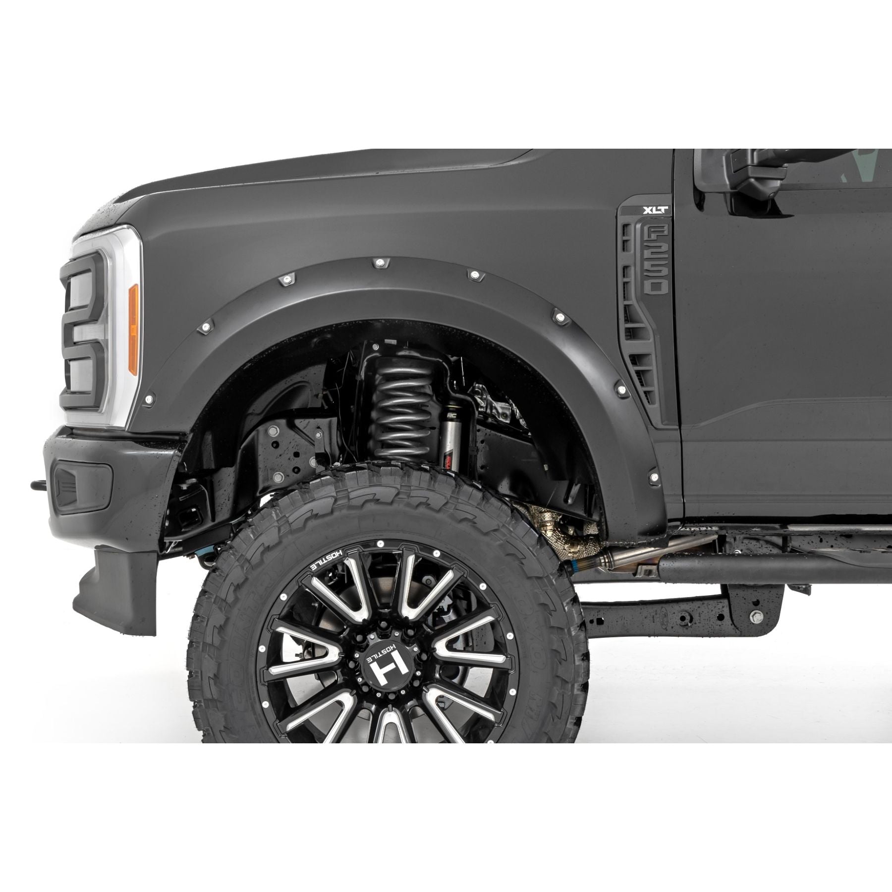 Add aggressive good looks quickly and easily with Rough Country's Fender Flares. Nothing compliments a new lift, wheels, and tires like a set of stylish, mean-looking fender flares. Rough Country's Fender Flares are designed with a simulated riveted look. These fender accessories bolt-on quickly and easily in a few secure mounting points, making installation a cinch. No cutting or drilling is required to install, and these flares can be easily removed and return your truck to stock! These UV treated fender flares ship in flat-black or can easily be painted to match your vehicle, and are designed to withstand the sun, rain and other elements of nature. Rough Country Fender Flares are guaranteed to be free of defects for 3 years! Tire Coverage: 2 in.