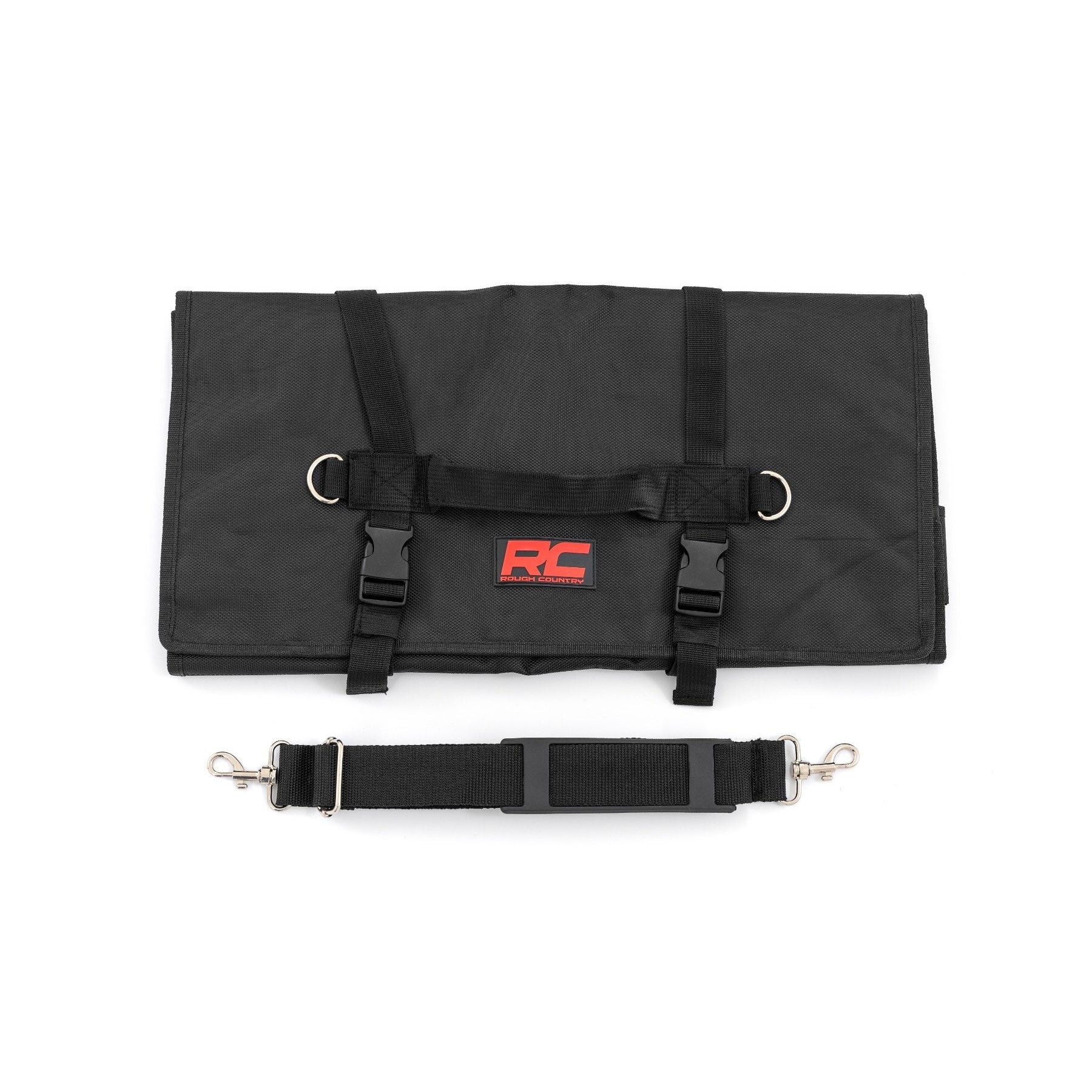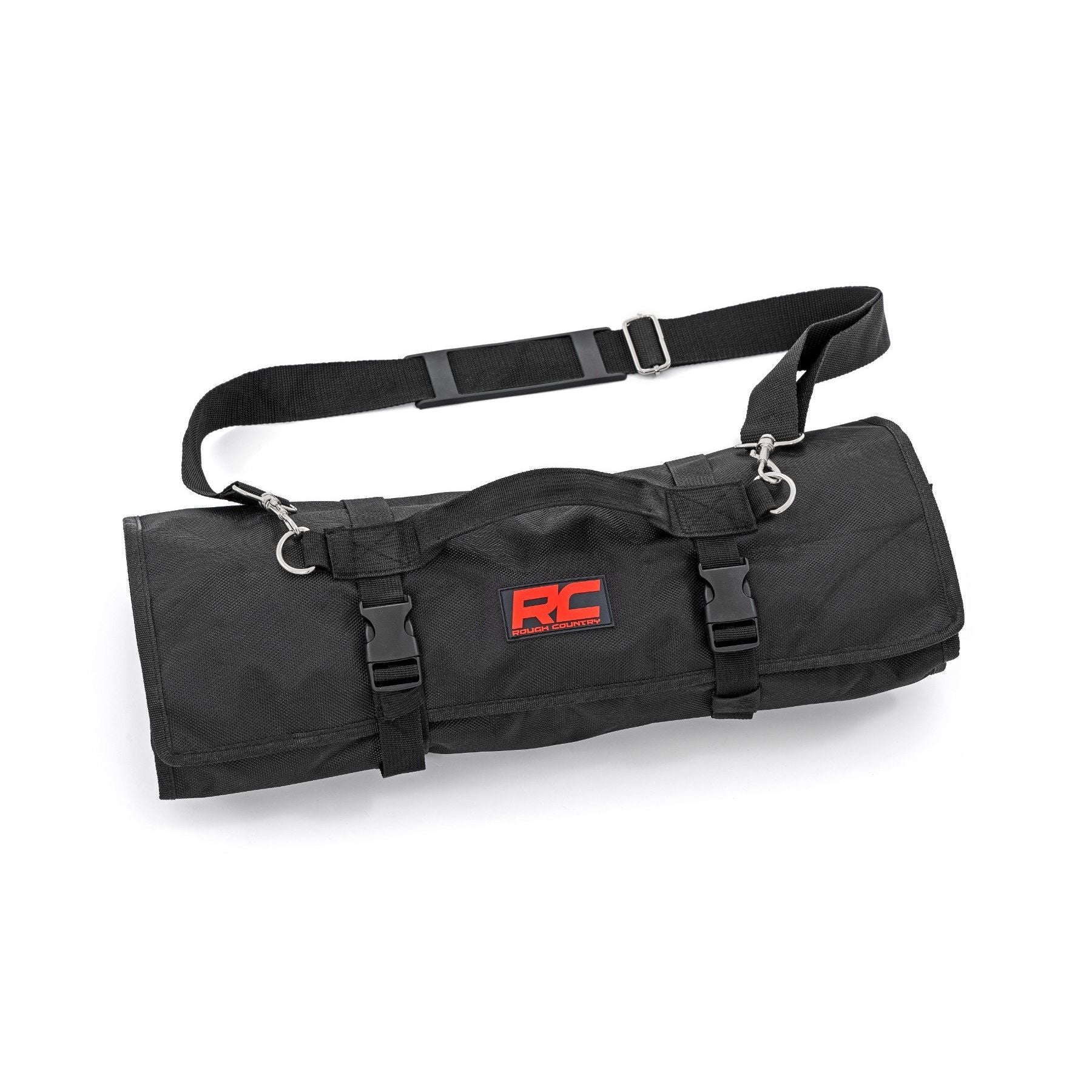 Tired of digging through a cluttered toolbox to find the right tool? Rough Country Roll-Up Tool Bag is designed to keep your tools organized, secure, and within reach, so you can spend less time searching and more time conquering the trails.Massive Storage: With 35 individual slots, you'll have plenty of room for everything from hammers to Allen wrenches. Plus, the dedicated socket pocket ensures your sockets are always organized and ready to go.Dead Silence: No more rattling tools driving you crazy. The Velcro closures on top, bottom, and socket pocket keep your tools securely in place, so you can focus on the ride.Easy Roll-Up and Go: Need to pack it up quickly? The quick-snap buckles and cinch-tight straps make it a breeze to roll up and secure your tools.Built to Last: Crafted from water-resistant nylon oxford material, this tool bag is built to withstand the toughest conditions and keep your tools protected.Easy Carry: The comfortable grip handle and strong X-stitched shoulder strap make it easy to carry your tools, no matter where your adventure takes you.This tool bag is ready to go wherever you are. Whether youΓÇÖre tightening things up or making trail-side repairs, having your tools organized and in reach means less hassle and more adventure. Tailored to work with most UTVs and other vehicles that use metric tools.