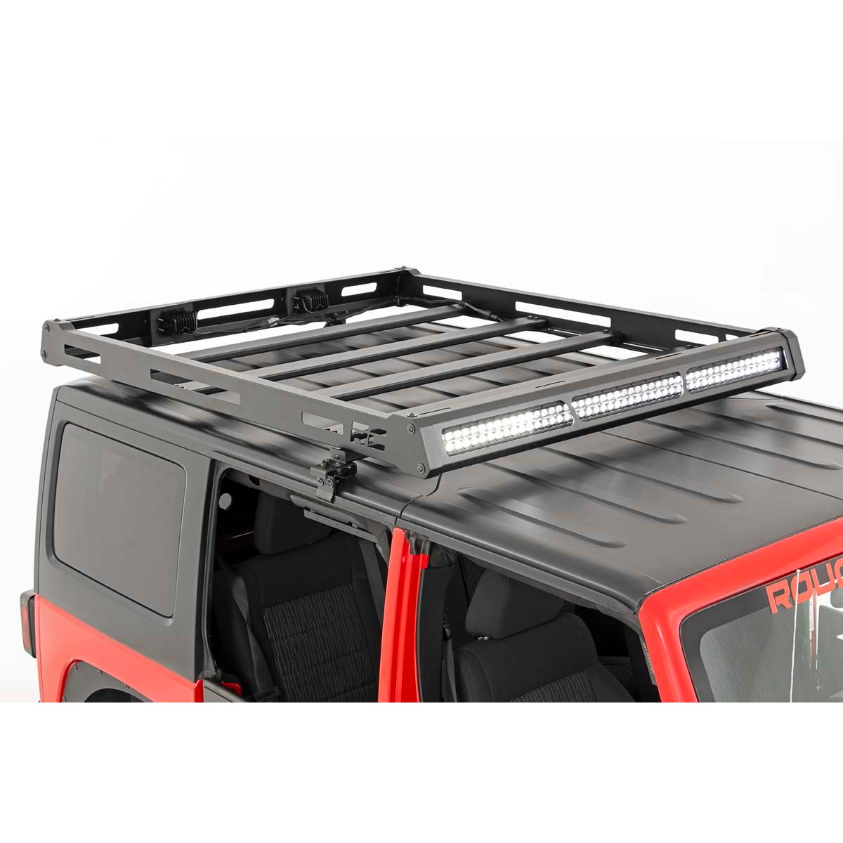 If youΓÇÖre looking for an eye-catching upgrade that also practical, Rough Country Roof Rack Kit is easily the best roof rack on the market! This bolt-on JK roof rack offers plenty of room to haul all of your gear without sacrificing space inside the vehicle. Rough Country Jeep Roof Rack Kit features 4 durable steel slats to help you firmly secure your gear and is available with optional front and rear LED lights for off-road illumination when you need it most.
