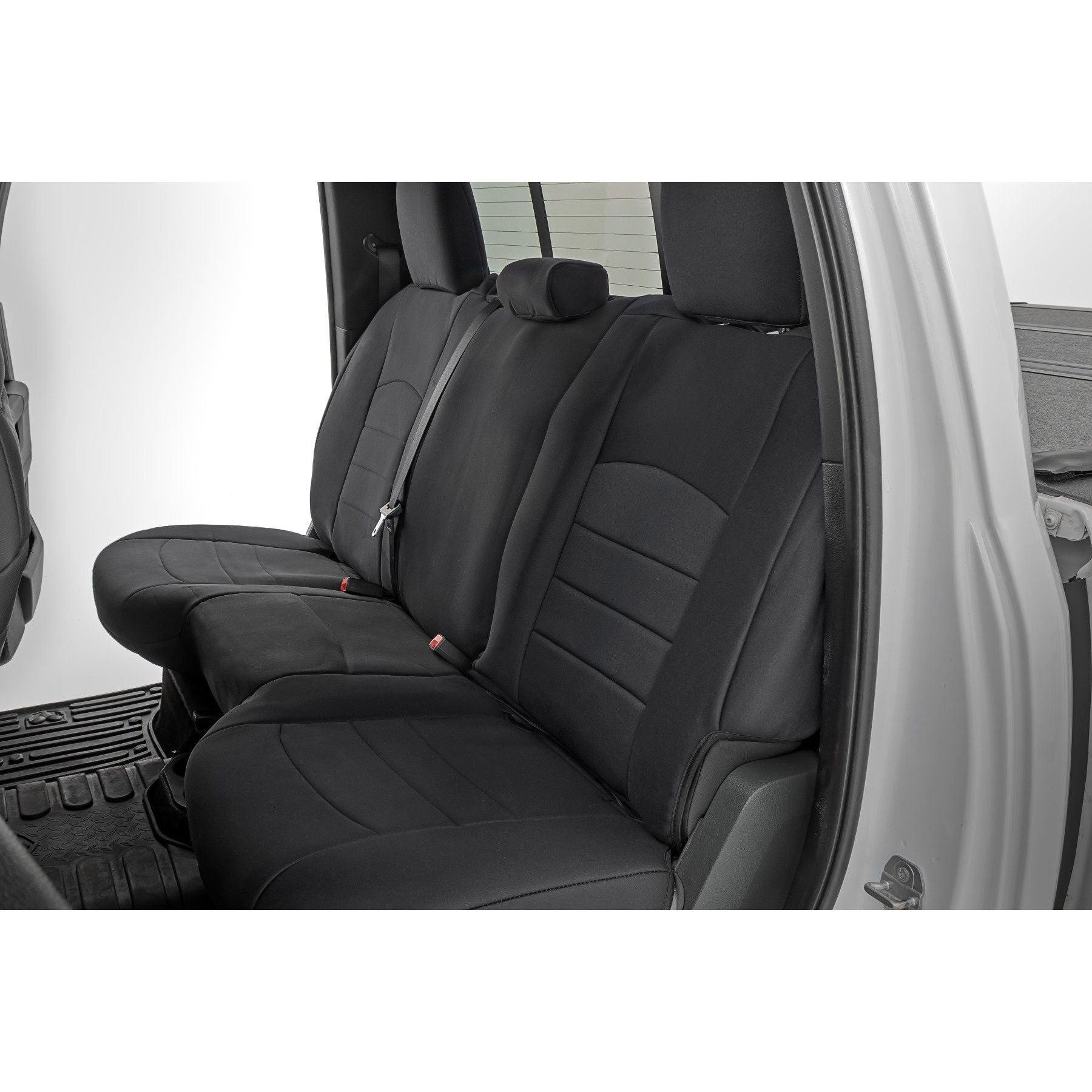 Want to protect your seats or are your seats showing signs of wear and tear from daily use? Say goodbye to unsightly stains and deterioration with Rough Country's Neoprene Seat Covers - the ultimate solution for preserving your vehicle's interior.Snug Fit for Optimal Protection: Our seat covers are tailored to fit your seats perfectly, providing a protective barrier against spills, scratches, and everyday wear and tear.Factory-Spec Construction: Engineered to meet factory specifications, our covers blend seamlessly with your vehicle's interior, giving it a fresh, new look without compromising on quality or style.Four-Layer Defense: With a four-layer construction featuring foam padding and a durable polyester shell, our seat covers offer unmatched protection and longevity, ensuring your seats stay looking new for years to come.Breathable and Water-Resistant: The neoprene layer not only provides breathability for added comfort but also boasts water-resistant properties, safeguarding your seats from spills and stains.Complete Coverage: Our covers come with full protection for your front seats, including headrest covers where applicable, as well as rear covers to shield your back seats from children and pet-related mishaps.Peace of Mind Warranty: Rest easy knowing your purchase is backed by our two-year warranty, giving you confidence in the durability and reliability of our product.Don't let worn-out seats diminish your driving experience. Upgrade to Neoprene Seat Covers today and enjoy a fresh, stylish interior that's protected against the rigors of daily life on the road. Snug Fit: Hugs seats tightly for a sleek, secure look.