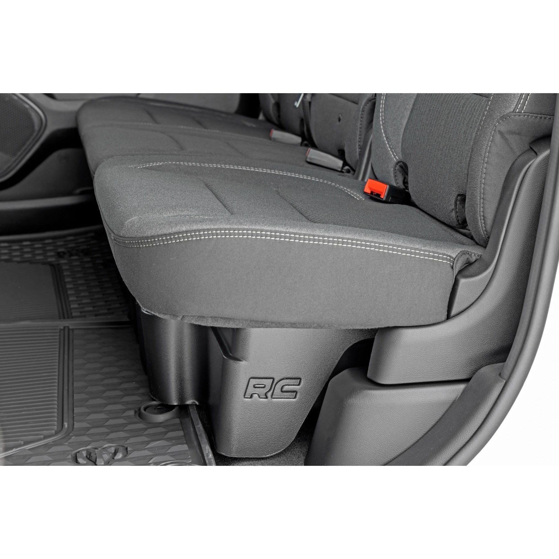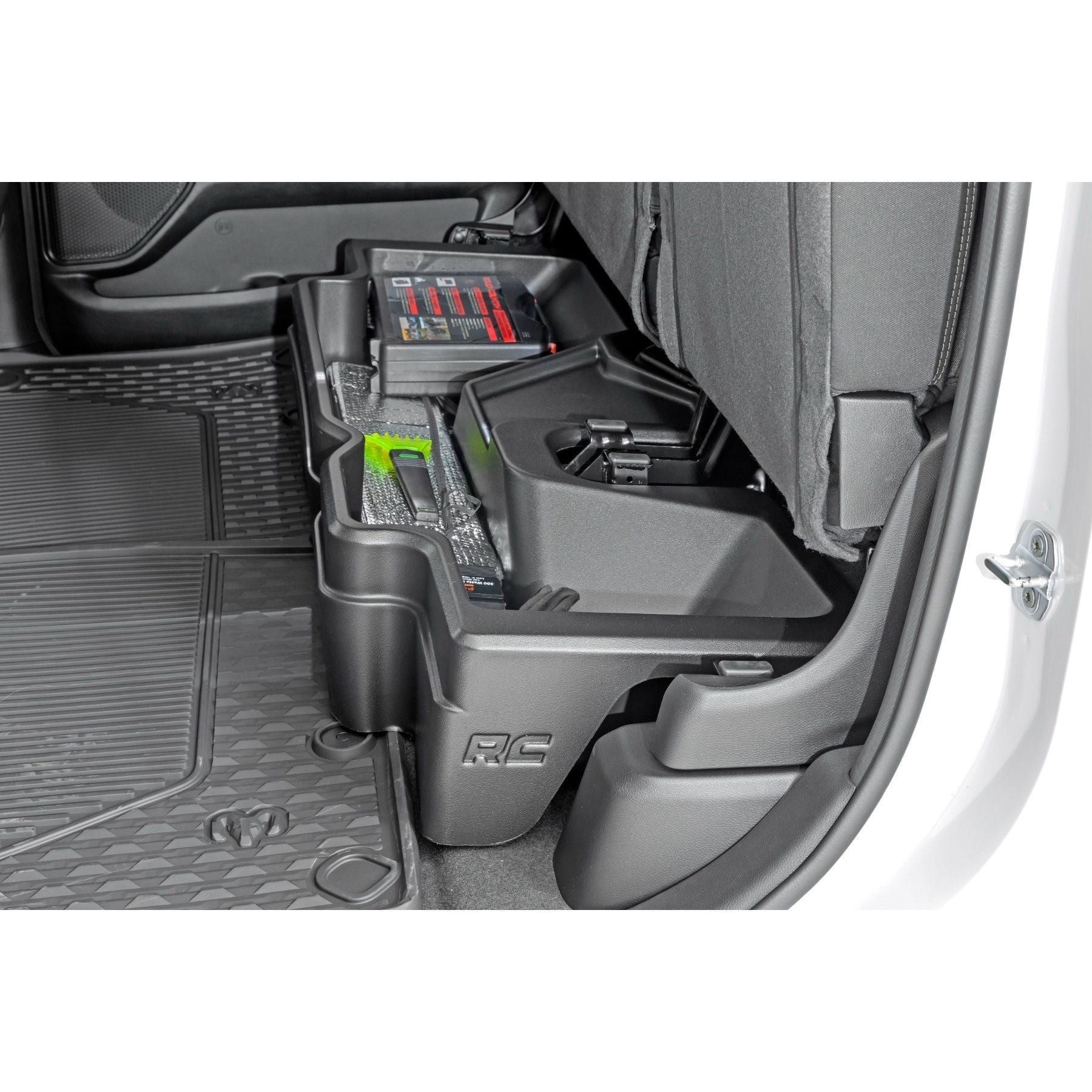 Each under-seat storage tray is constructed from a durable, high-density thermoplastic material that built to withstand kicks, nicks, and corrosion. A convenient anti-skid surface helps prevent the contents of your underseat cargo tray from rolling around while driving. Best of all, Rough Country Custom-Fit Under Seat Storage Compartments are easy to install, so you can upgrade your cargo management quickly and easily! Easily organize your storage!