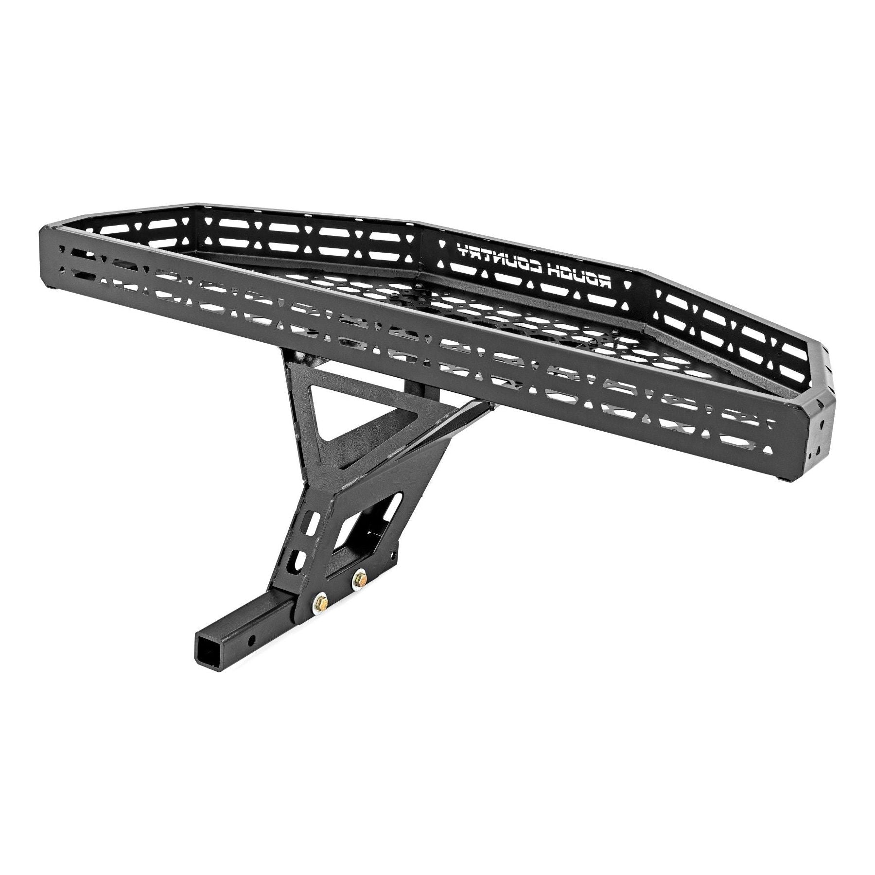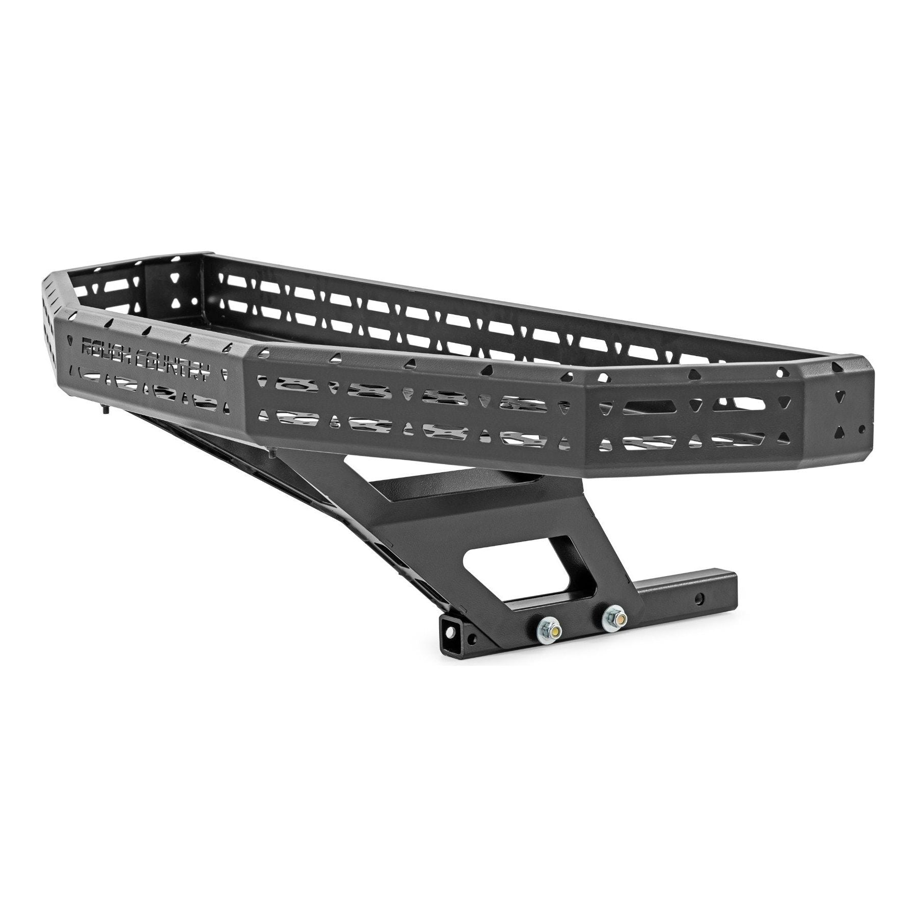 Durable Storage Solution! Rough Country's Rear Hitch Cargo Rack is designed to fit a 2" hitch receiver and can be easily mounted and removed using the included hitch pin. Multiple hitch pin locations allow you to choose the best placement on your vehicle to keep it clear of road obstacles while remaining at an easy loading height. Crafted from 14-gauge steel, the cargo rack's powder coat finish helps prevent rust, chipping, and corrosion, so your rack looks new season after season.