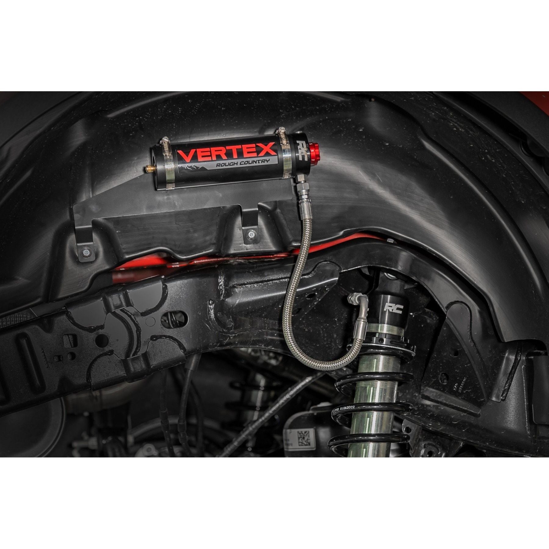 Unrivaled Performance: Unmatched Ride Quality. Experience the pinnacle of off-road control with Rough Country's 2.5 Vertex 8-Stage Adjustable Reservoir Coilovers - precision-engineered to dominate any terrain while delivering a smooth, customizable ride.Dial In Your Ride: With an 8-stage adjustable damping system, you have complete control over your suspension. Whether you're cruising city streets or tackling extreme off-road challenges, a simple turn of the dial fine-tunes your ride for comfort or aggressive performance.Built for the Extreme: Featuring a monotube design with an external remote reservoir, these nitrogen-charged coilovers increase oil capacity and damping sensitivity for superior heat dissipation and fade resistance. A massive 2.5-inch piston and 22mm chrome-hardened piston rod ensure maximum durability and performance in the toughest conditions.Engineered for Durability: A 3-stage seal system prevents dirt, debris, and fluid leakage, while the honed steel body and heat-treated alloy bearing extend longevity. The zinc-plated finish with a double clear coat and unbeatable salt spray resistance (over 400 hours) provide exceptional corrosion protection.Premium Design: These coilovers don't just perform - they turn heads. Featuring CNC-machined billet aluminum accents, a laser-etched RC logo, and premium "Vertex" decals, they combine high-end aesthetics with rugged reliability. They also feature a durable braided steel reservoir line and a laser-etched bracket system, ensuring a sleek, professional finish.Backed by Confidence: Covered by Rough Country's 3-year manufacturer's warranty, these coilovers offer long-term reliability and peace of mind for every adventure.Upgrade your ride today with Rough Country's 2.5 Vertex Coilovers - because performance, durability, and style should never be compromised. Complete Front Coilover Set: Includes both driver and passenger side for balanced performance and precise handling.