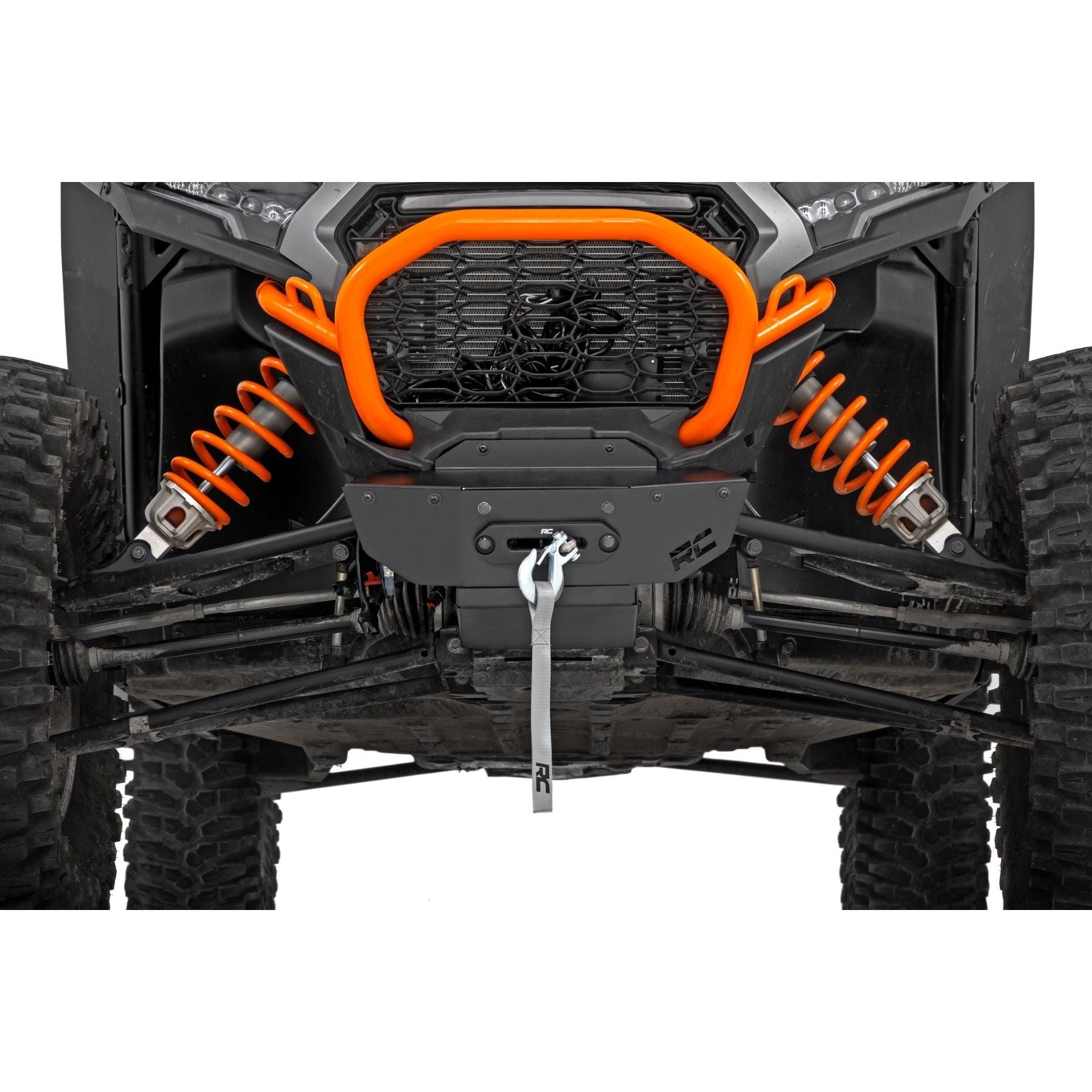 Reliable Recovery Power: Be prepared for whatever the trail throws at you with Rough Country's Winch Mount for the Polaris RZR XP 1000. Engineered for superior functionality, this must-have upgrade equips your UTV with dependable recovery capabilities, giving you the confidence to tackle tough terrain and unexpected obstacles. The 100% bolt-on design ensures a quick, secure installation with no cutting or trimming required.Built to Take a Beating: Constructed from ultra-durable 1/4-inch and 7-gauge steel, this mount is built to perform under pressure. Its black powder coat finish adds long-lasting corrosion resistance and a rugged, aggressive look that holds up against the elements. Designed to accept both 4500 LB and 6500 LB Rough Country synthetic rope winches, this mount gives you powerful options for any recovery need. Whether you're climbing rock trails or buried in the mud, this setup delivers the strength and reliability you demand.Easy Installation: Guaranteed Durability. With a 100% bolt-on fit and all necessary hardware included, installation is simple and hassle-free no cutting or trimming required. Plus, it's backed by Rough Country's limited lifetime replacement warranty, protecting your investment from structural and workmanship defects. Ride with confidence knowing your gear is covered when it matters most. Easy Bolt-On Installation: Get your winch mounted quickly and securely without complicated modifications.
