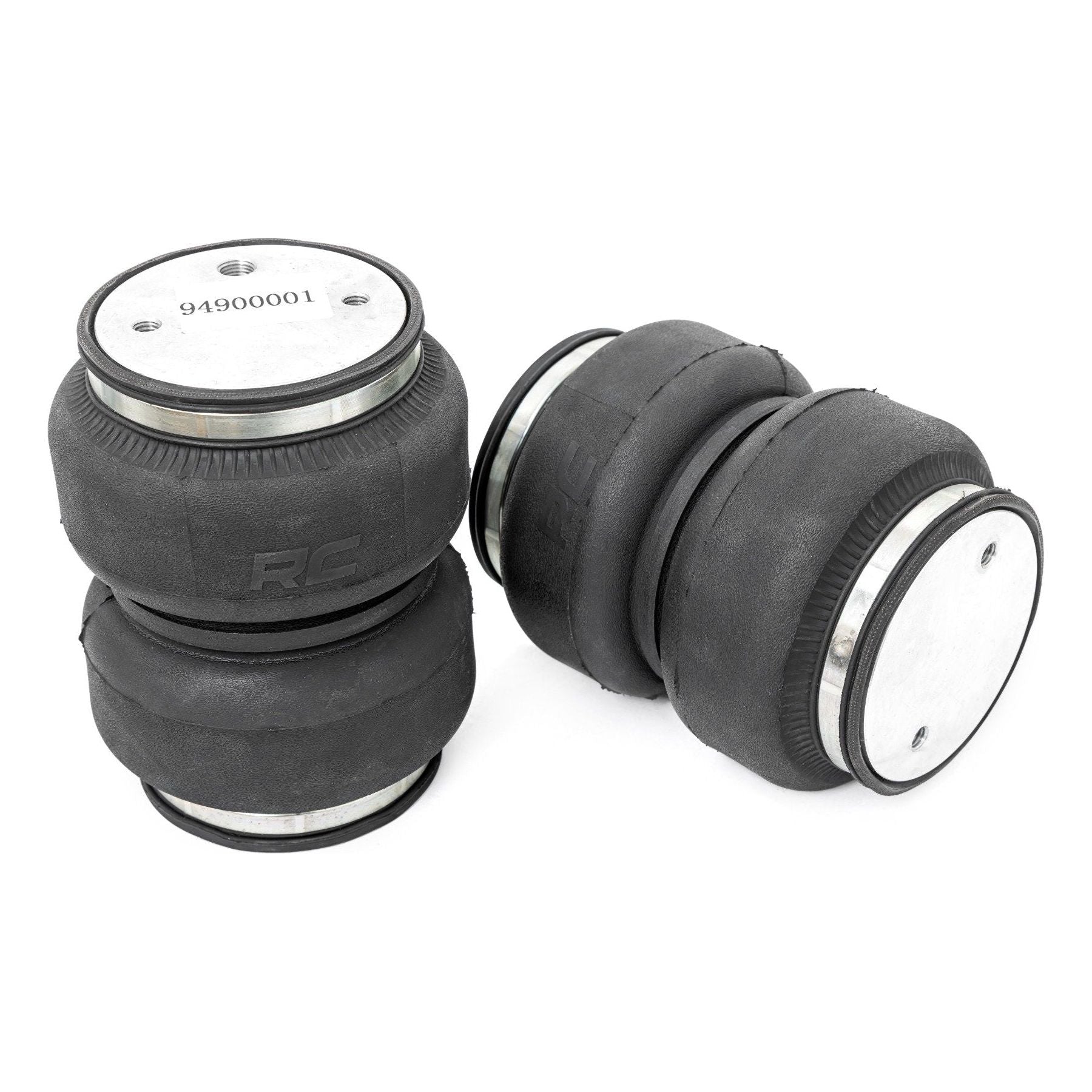 Heavy-duty Construction. Rough Country's Rear Air Spring Kit features two RC branded high-quality double convoluted airbags complemented with DOT-approved airlines. Whether you plan on towing or hauling in the not-so-distant future Rough Country's Air Spring kit is the must-have accessory to ensure that your trailer is level reducing the weight off of the tongue of your trailer. Each kit offers 1/4" push connector fittings and all of the bracketry needed to ensure installation is lightning fast and secure! Rough Country's Air Spring kit provides up to 5,000 lbs of load support to ensure that you experience less sway and bottoming out when braking and steering!
