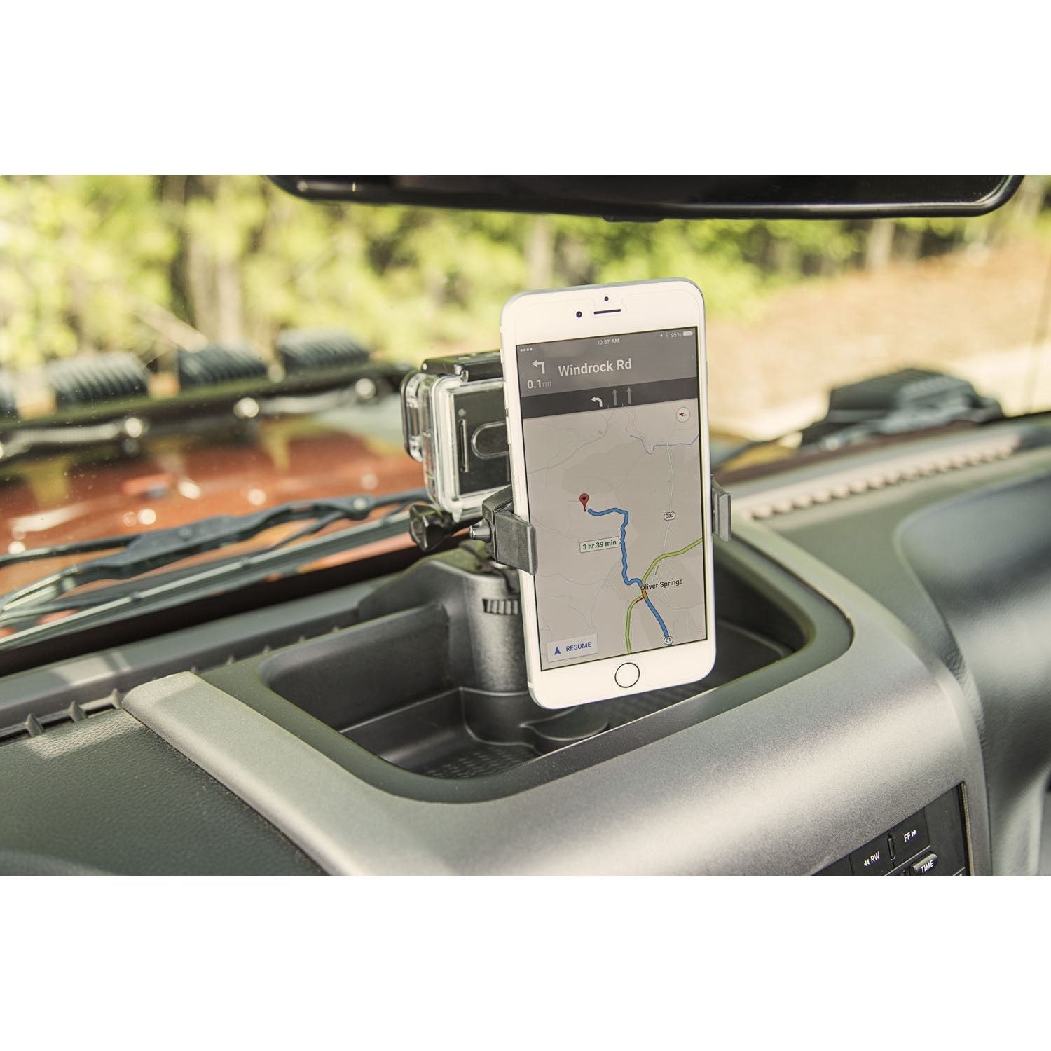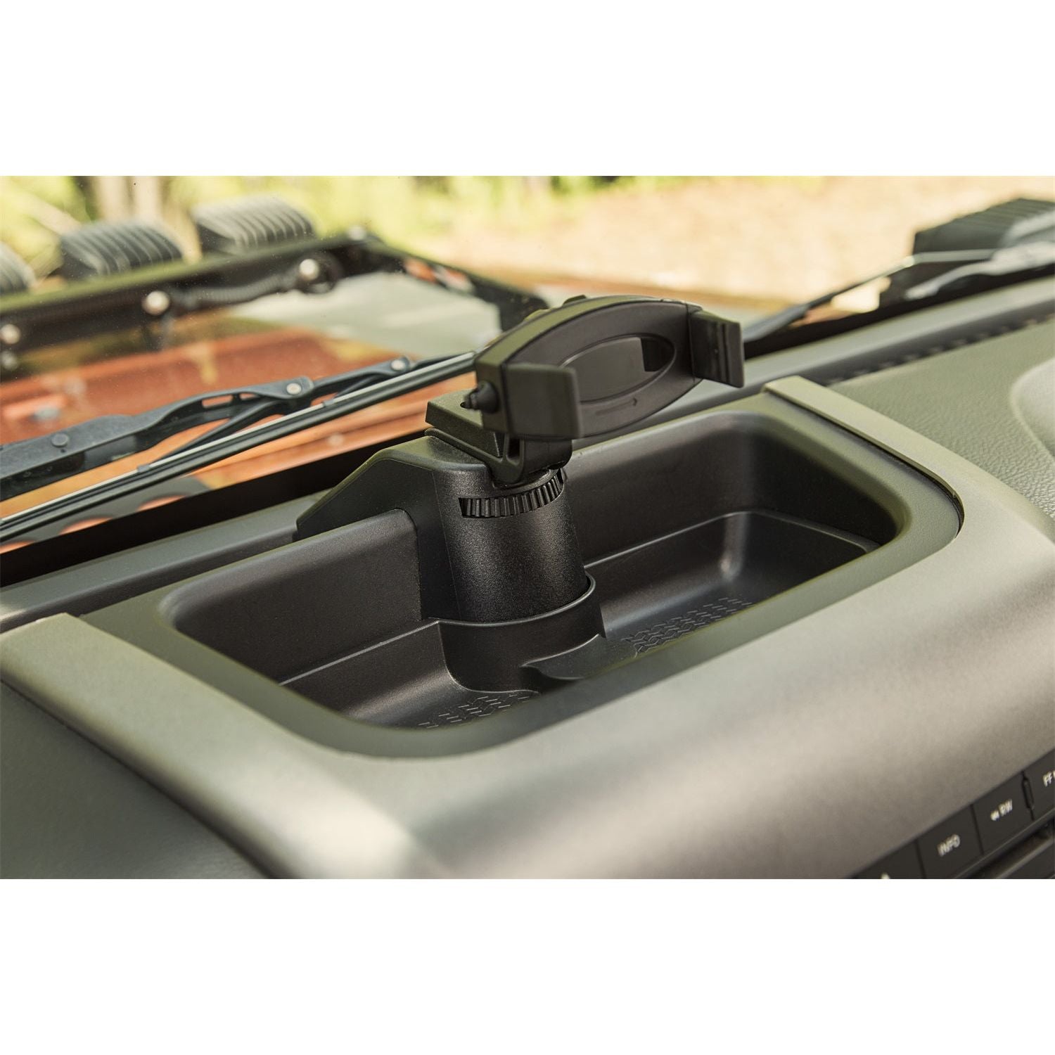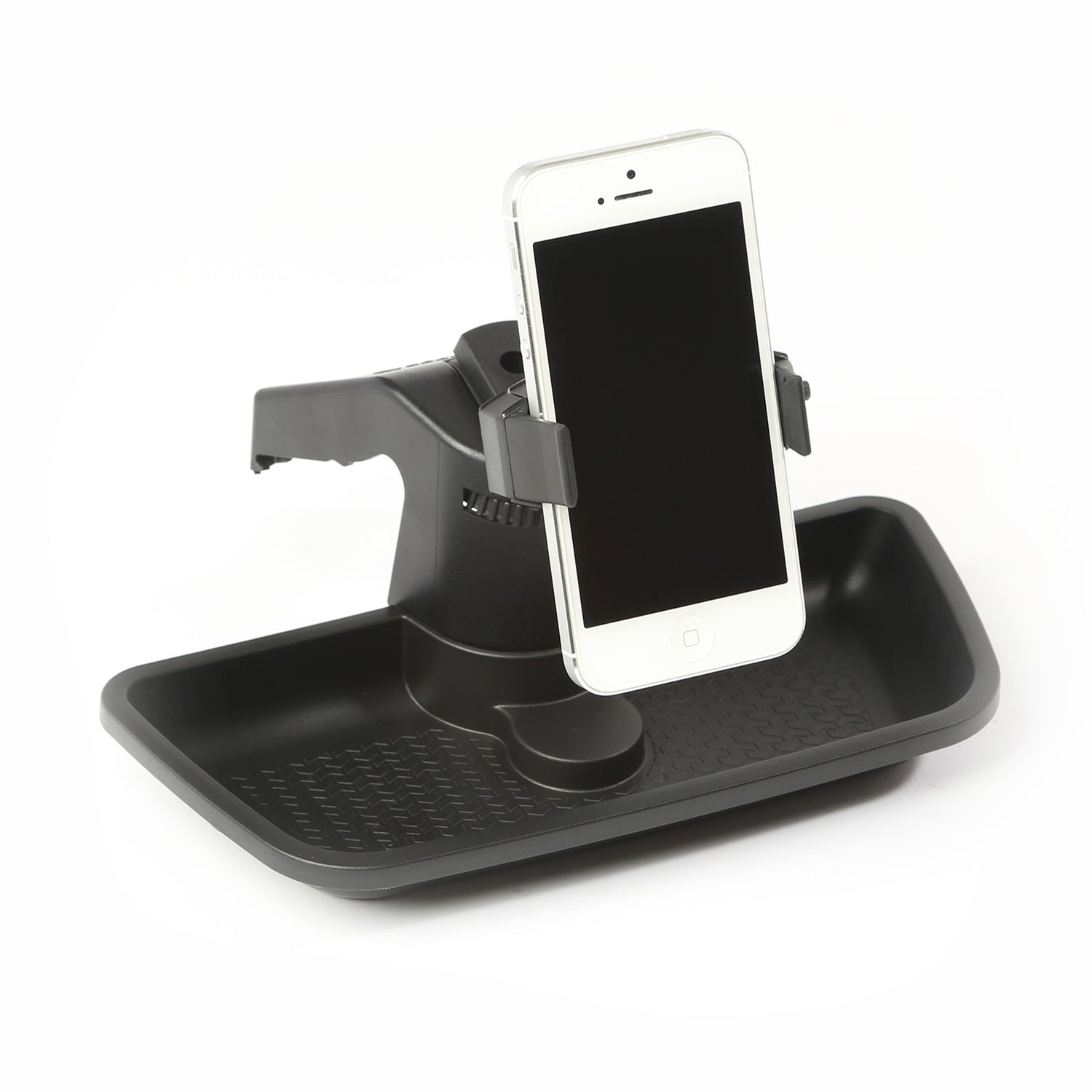 With this Dash Multi Mount Phone kit from Rugged Ridge, you can take your smartphone along for the ride! The custom fitted cradle holds your smartphone securely during trail rides. With your hands safely on the steering wheel, now you have an attachment point for convenient access to your phone, Go Pro, or POV Camera, so you wont miss a moment of trail action. This system mounts to the dash recess of the JK Wrangler with no drilling required. Will accept up to 3.6- in. wide phones.