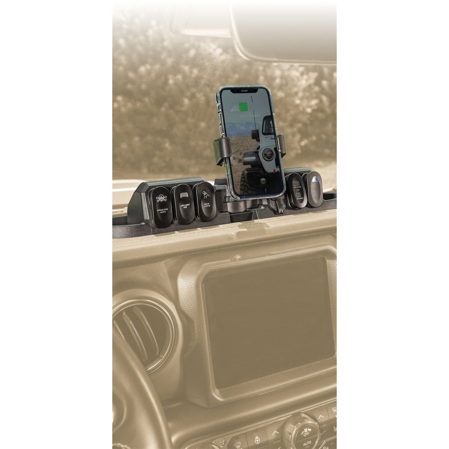 The Dash Mount Switch Pod from Rugged Ridge is a patented design that integrates seamlessly with the Jeep's factory upper dash insert and features six pre-molded slots that make it easy to house electrical switches for powering off-road lights, compressors, w inches, etc. In addition, a sturdy cellphone mount provides a secure mounting location for your phone, with the ease & convenience of wirelessly charging built in (Qi-enabled device required). Kit includes switch pod base, wireless charging phone mount, charging cable, four 2-position rocker switches (amber/blue/green/red), 2-position off-road lights switch (amber), and dual-USB port switch. Fits all 2018-Present Jeep Wrangler JL / JLU and 2020-Present Gladiator JT models. (Patent No. D765,016 US 9,132,779 US 9,283,898)