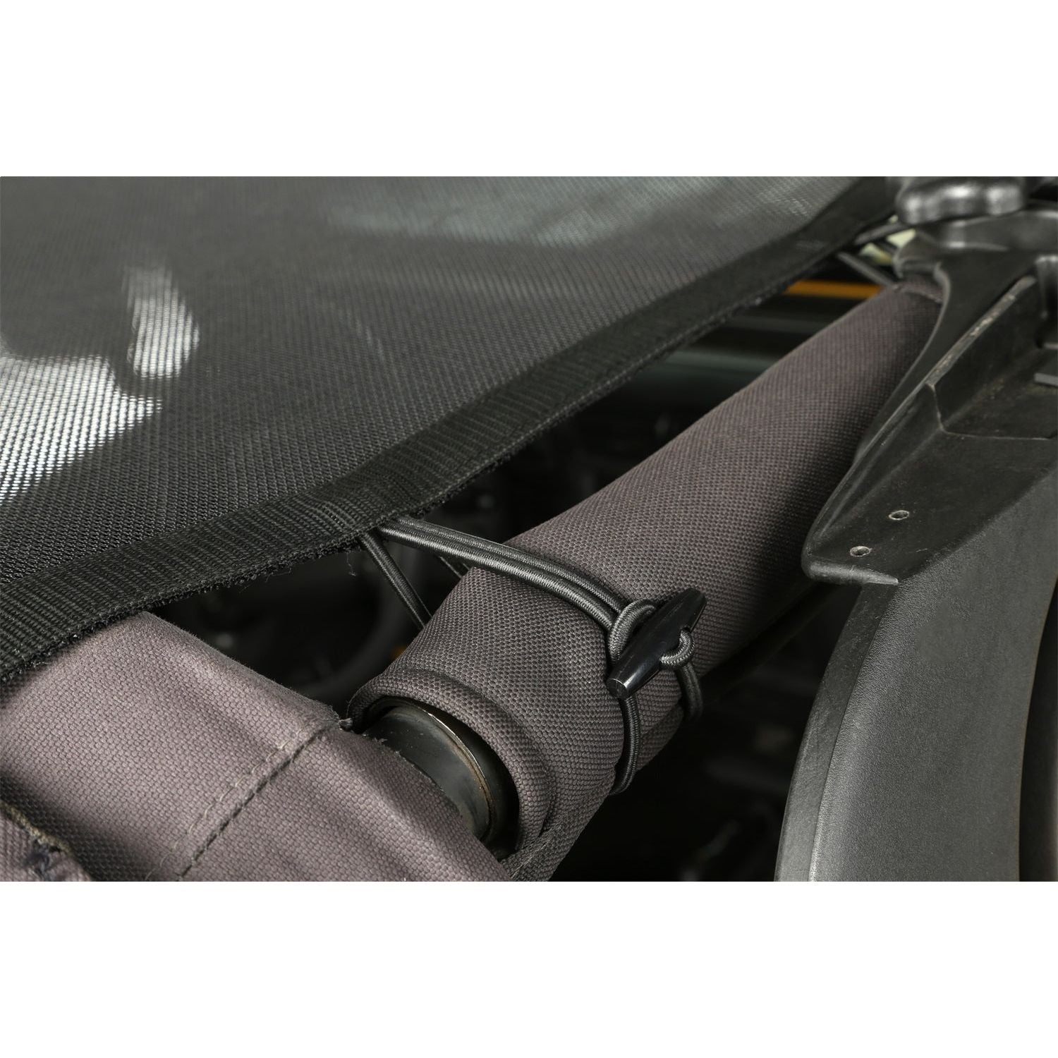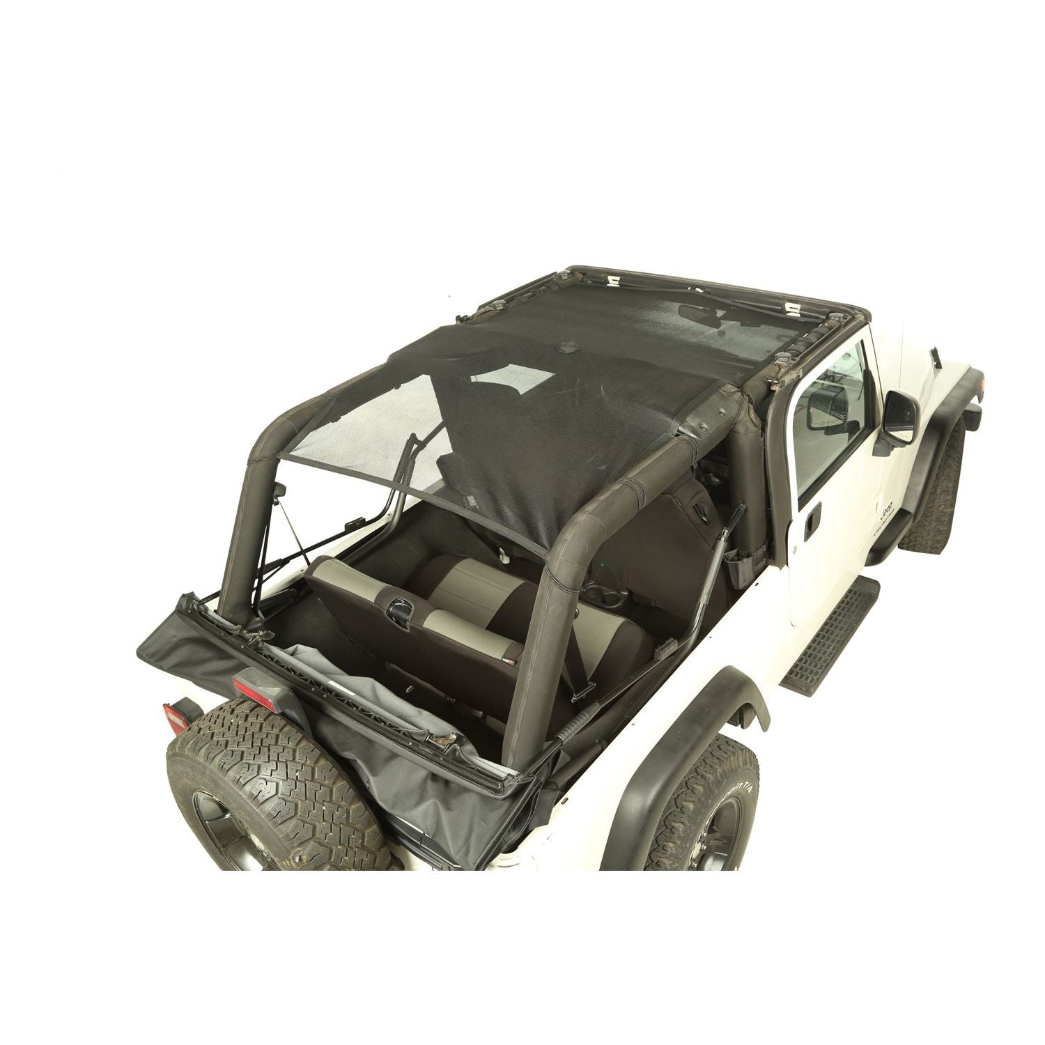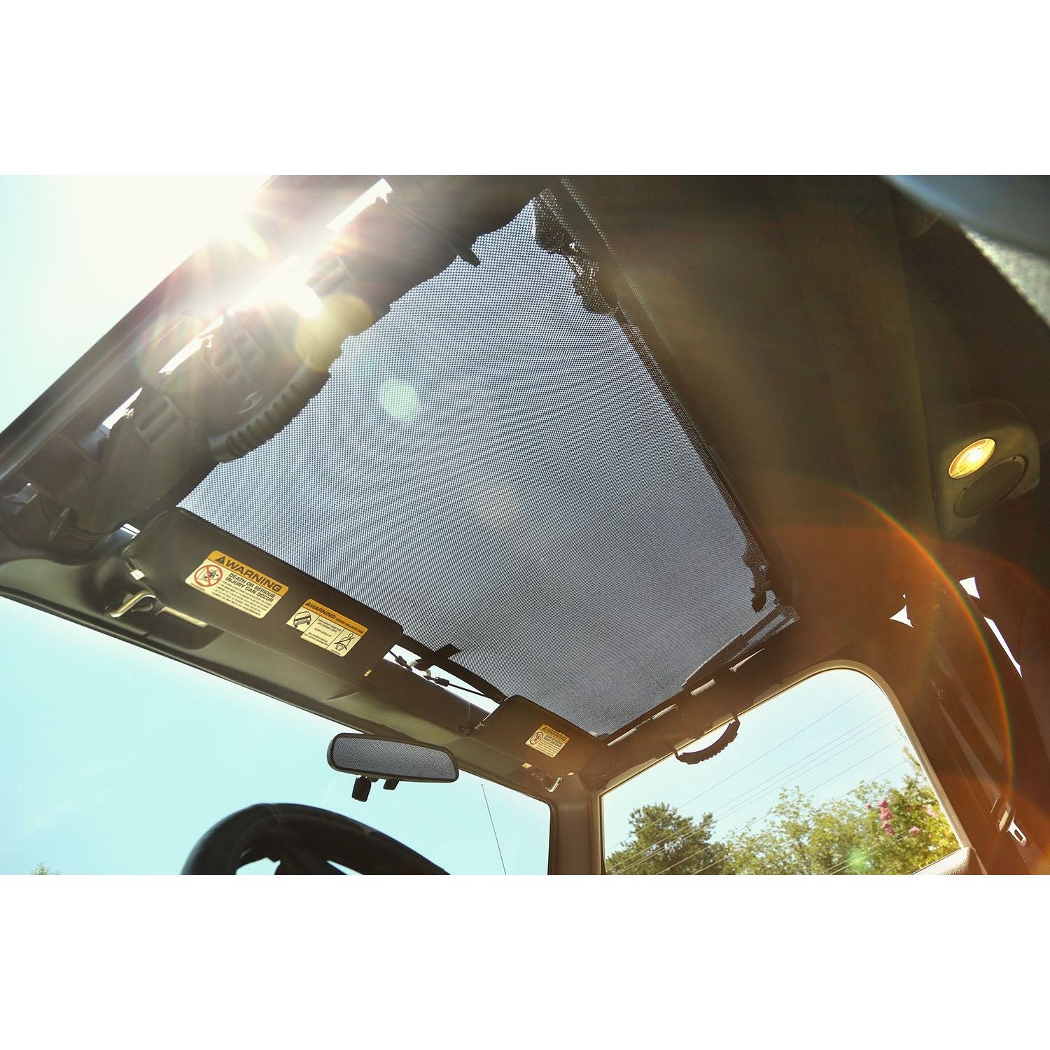 Craving that top down experience in your Jeep, but still want protection from harsh sunlight? This full-length shade protects both front and rear passengers from the sun while offering a top down feeling. With mesh construction, this sun shade is held between the windshield and the rear crossbar, eliminating the need for a header channel. The built-in elastic straps allows this design to retain access to the Jeeps top clamps, so you can keep the shade in place and still use the factory top.