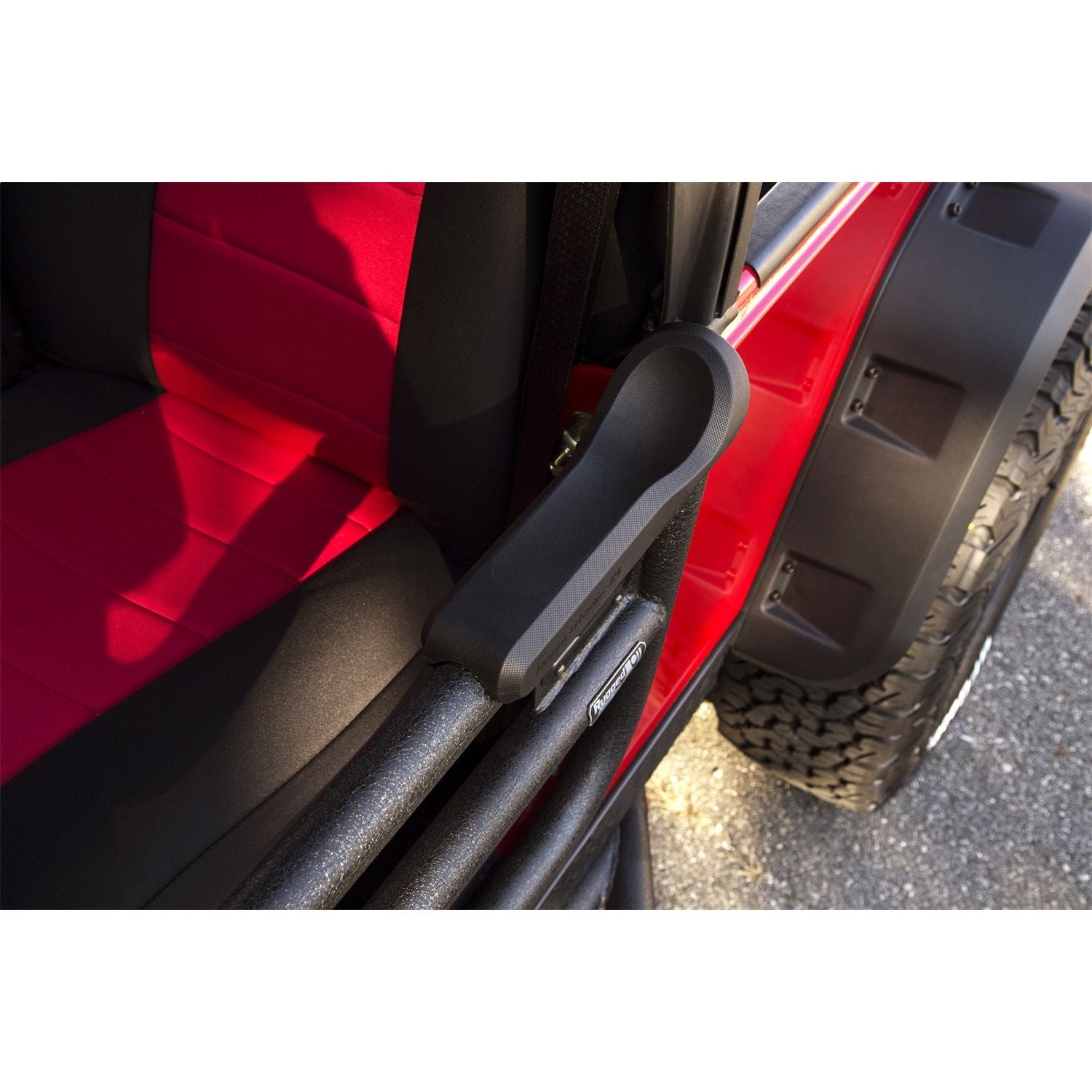 Add full-door comfort to your Jeep Wrangler tube doors with Rugged Ridge Tube Door Arm Rests. Our injection-molded foam arm rest pad attaches to the upper door tube providing an ergonomic resting position for both drivers and passengers. When off-roading or in extreme driving conditions, the arm rest pad enables a more comfortable driver position, eliminating fatigue and adding to overall enjoyment. Each arm rest pad is designed to provide a comfortable fit on front or rear tube doors and secures with the attached automotive grade double-sided adhesive. Sold in pairs