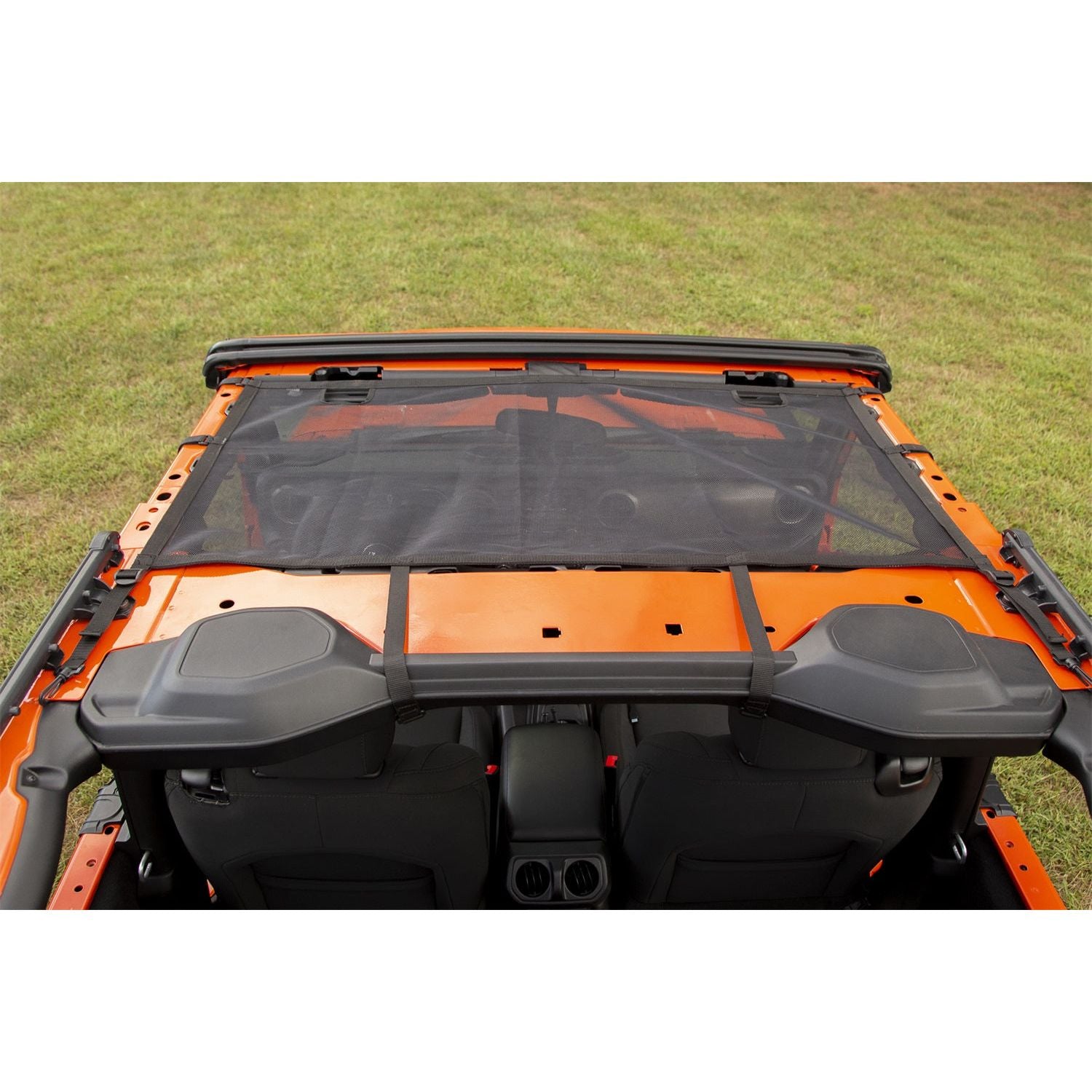 Looking for a summer top that is easy to install and remove? The Rugged Ridge Eclipse Sunshade gives the open air and top down feeling you want, while providing added protection from harsh sunlight. Featuring reinforced mesh construction with integrated straps, the half sun shade (13579.74) installs between the front portion of the JL sports bar and windshield to protect front seat passengers while the full-length sun shade (13579.75) is secured between the windshield frame and the rear portion of the JL sports bar to protect both front and rear passengers simultaneously. An all-in-one package, this sunshade is simple to install and does not require any modifications. By retaining access to the Jeeps top clamps, drivers can keep the shade installed while maintaining full functionality of the factory soft top. The Eclipse Sun Shade can stay in place year round- making you fully prepared for that first sunny day.