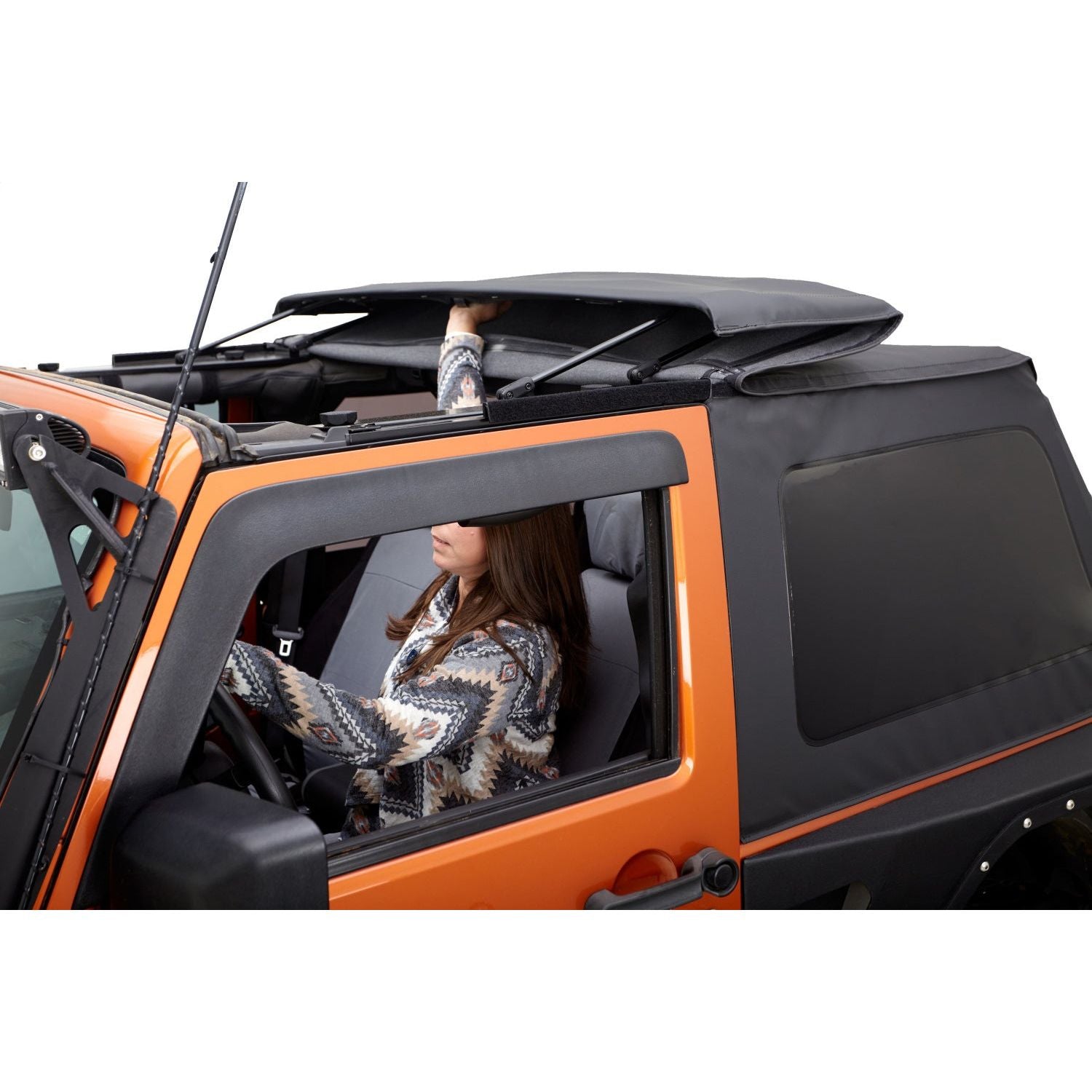 The Rugged Ridge Voyager Soft Top is easily the most stylish and versatile soft top available for Jeep Wrangler JK models. Designed with sleek, fastback styling and packed with all the features you could want in a replacement top. The Voyager's frameless design installs snugly over the factory sport bar for a contoured fit and low profile, with no bulky bows or unsightly bulges. Larger tinted side windows offer greater visibility and are easily removed by means of heavy duty self-correcting zippers. Once removed, the windows store conveniently inside the built-in overhead panel, keeping them safe from damage and ready to install at a moment's notice. Best of all, the Voyager top's fold-back feature affords you open-top enjoyment in just seconds. Constructed of 30 oz. premium sail cloth fabric with sealed seams, the Voyager Soft Top is built to last and backed by an industry-leading 5-year warranty.