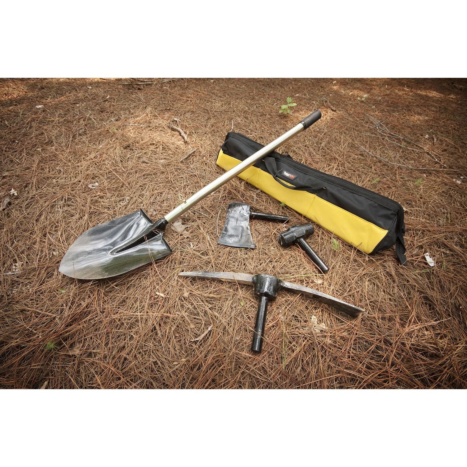 This four piece All Terrain recovery tool kit from Rugged Ridge includes a sturdy steel handle and four interchangeable tool heads. Kit includes heavy duty canvas bag, shovel, hammer, axe, and pickaxe.
