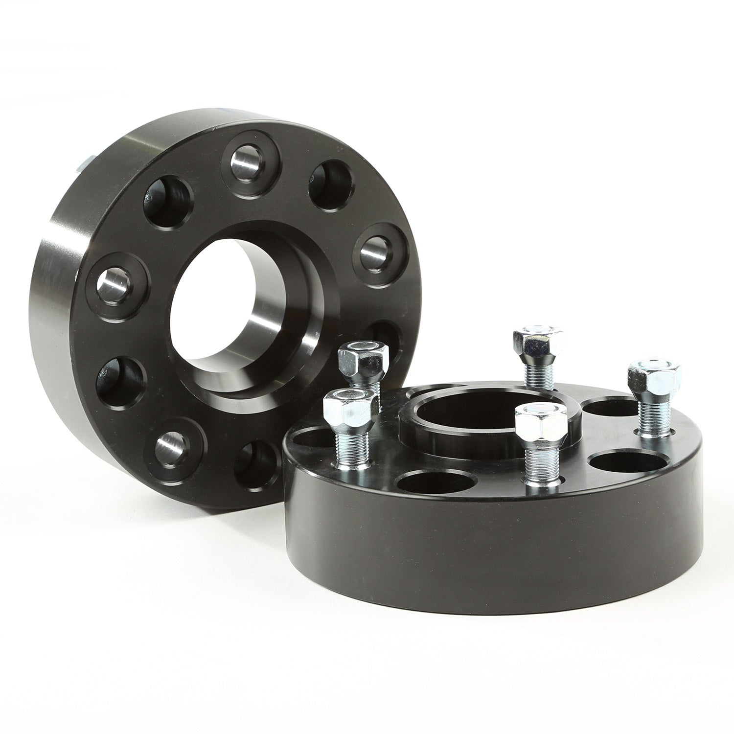 This pair of 1.75- in. thick black aluminum wheel spacers from Rugged Ridge moves your wheels out to help fit wider tires and give your Jeep a wider track and improved stability. Constructed of double anodized black extra thick 6061T6 aluminum for long life and extra corrosion resistance. All hardware is grade-8 for extra strength.