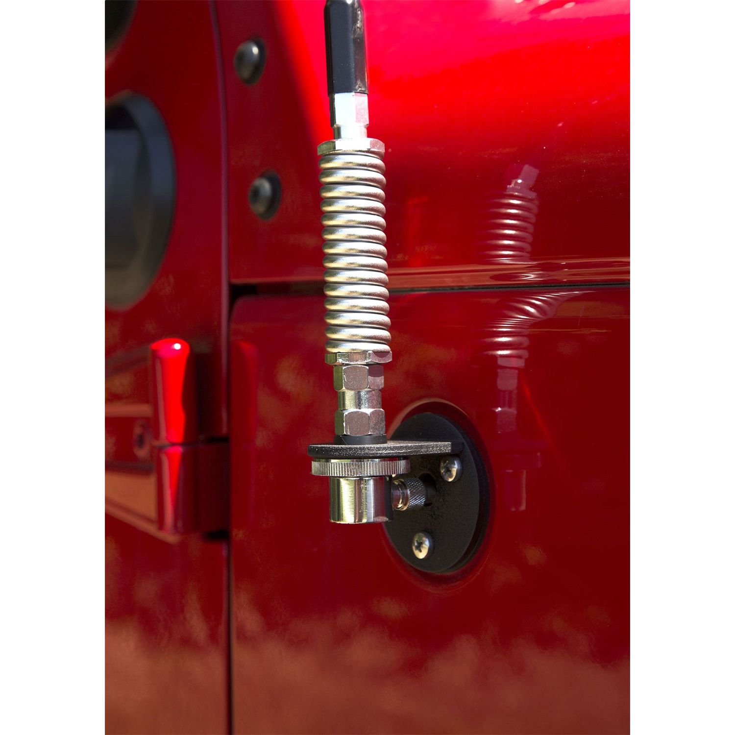 The Rugged Ridge CB/AM/FM Antenna Mount Kits ingenious new design delivers crystal-clear radio reception across all bands while maintaining the benefits of the factory JK antenna location. Replacing your factory antenna with our fully welded steel antenna mount will give you a convenient location to mount your choice of CB antennas (not included). The system includes the mounting bracket and all the necessary coaxial cable, wiring, connectors and hardware to complete the install- you just supply the antenna! No more whip antennas getting in the way of your rear lift gate or having to drill unwanted holes in your JK's body. With the Rugged Ridge CB/AM/FM Antenna System, your CB antenna will maintain the look of a stock setup but give you the advantages of an aftermarket antenna.